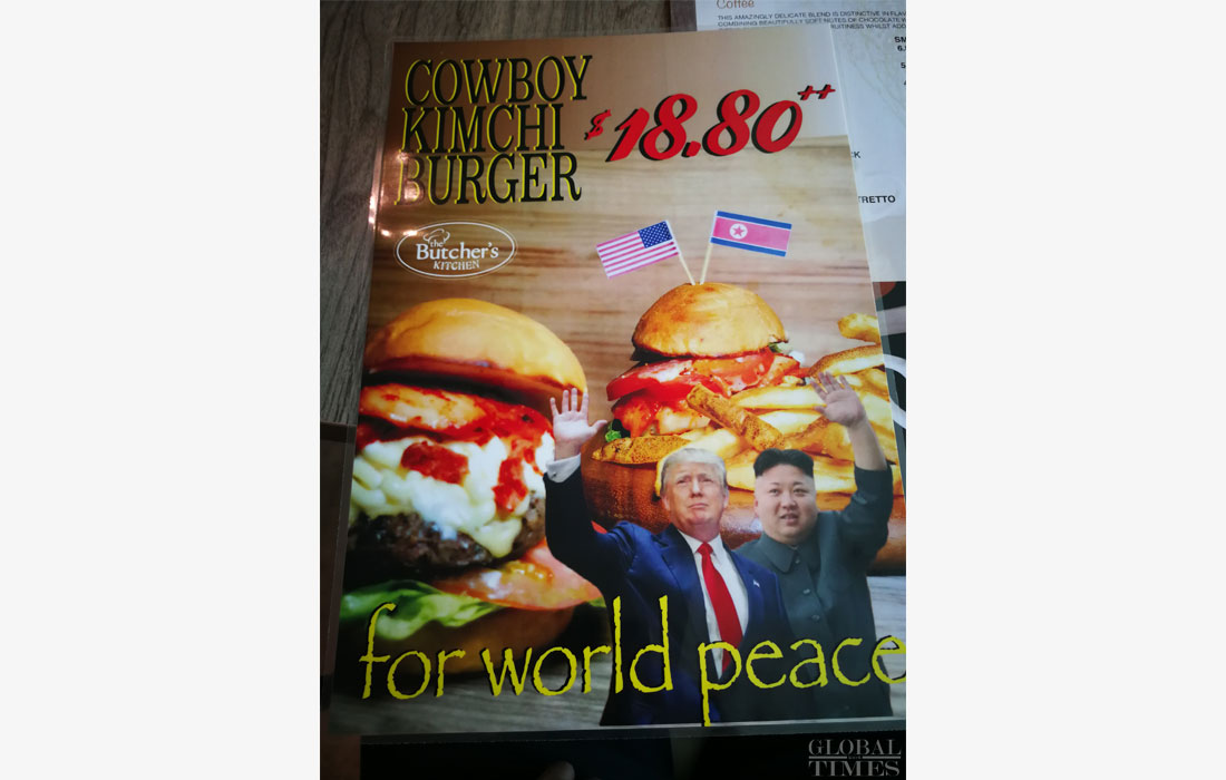 Photo taken on June 11 shows the advertisement for the “cowboy kimchi burger” at a restaurant in Singapore. US President Donald Trump and North Korean leader Kim Jong-un planned to meet in Singapore on June 12. Photo: Yang Sheng/GT figcaption >