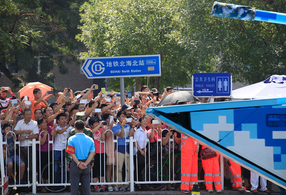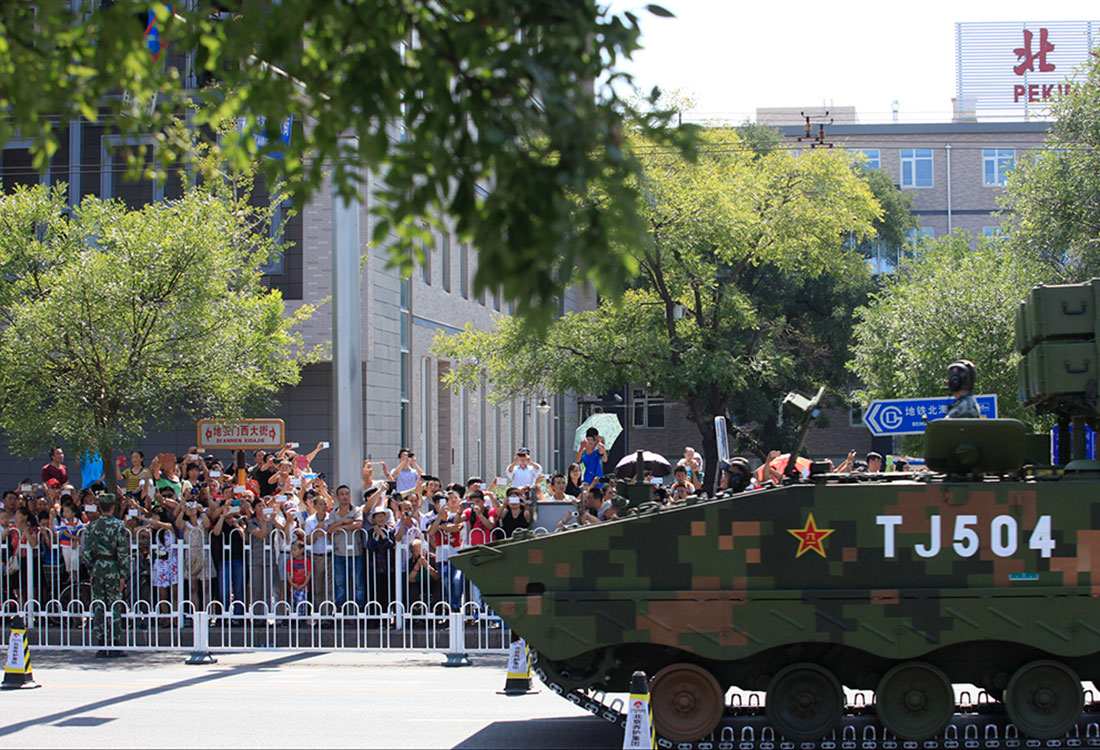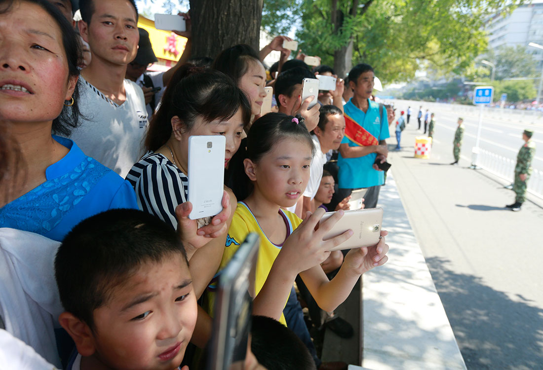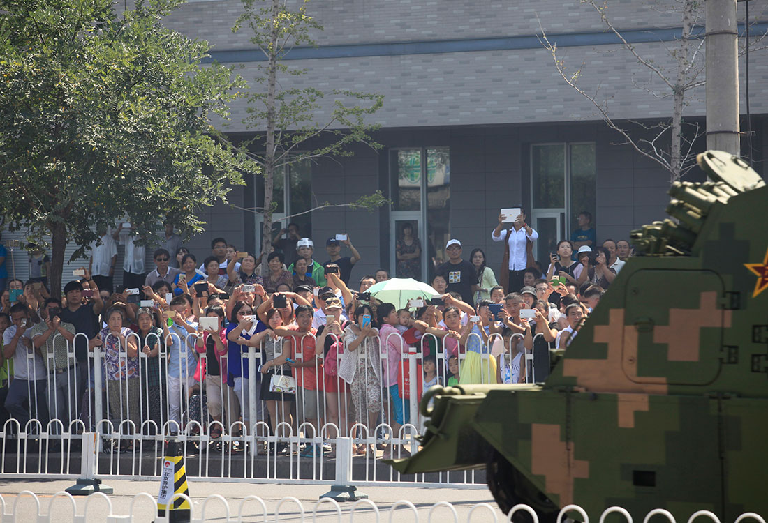 People gather at the crossroad of Ping'an Dajie and Xishiku Dajie in Beijing to watch the parade vehicles at the September 3 V-Day parade. Photos: Li Hao/GT