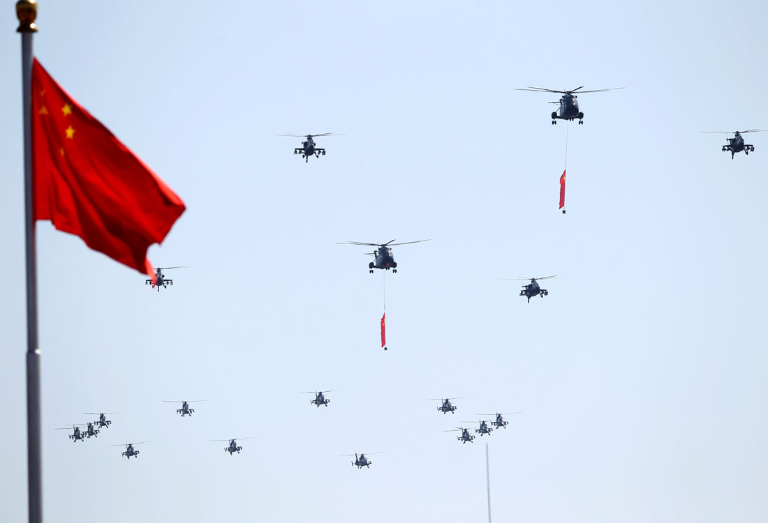 A group of helicopters flies over Tiananmen Square, with the leading Z-8A helicopters displaying two Chinese flags, during the V-Day parade in Beijing on September 3. Photos: Cui Meng/GT