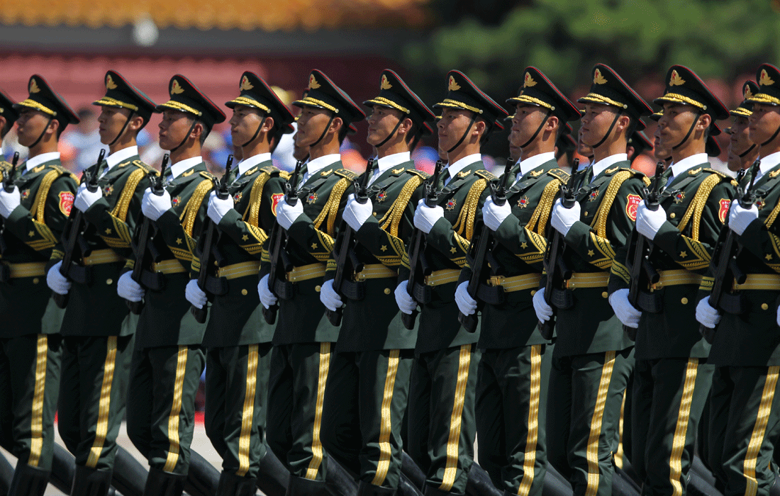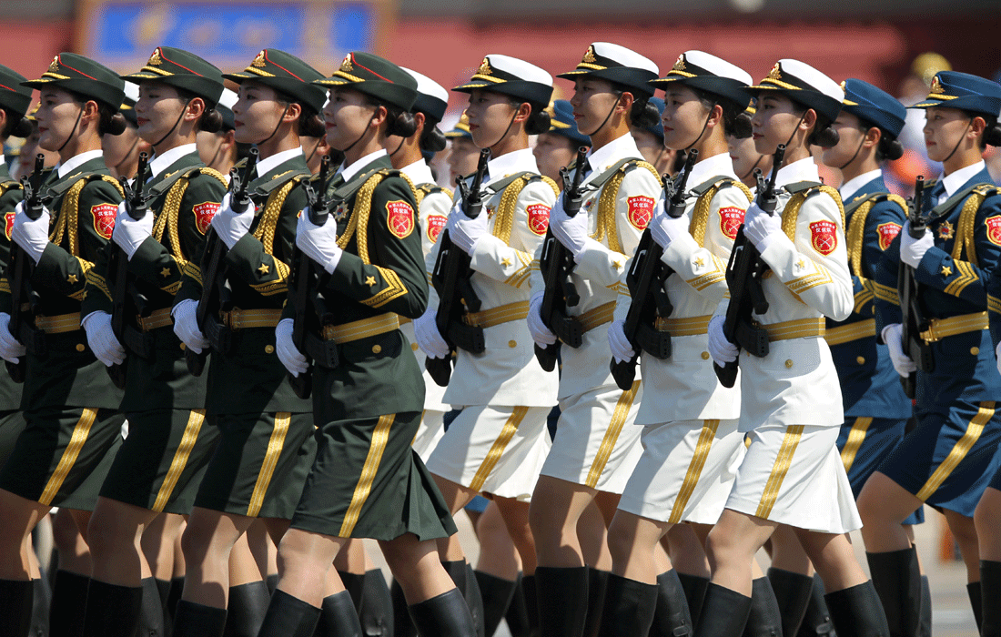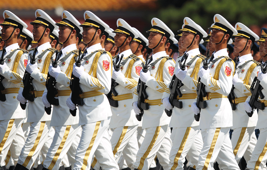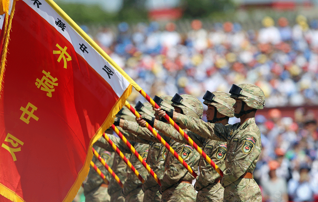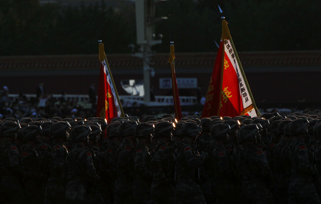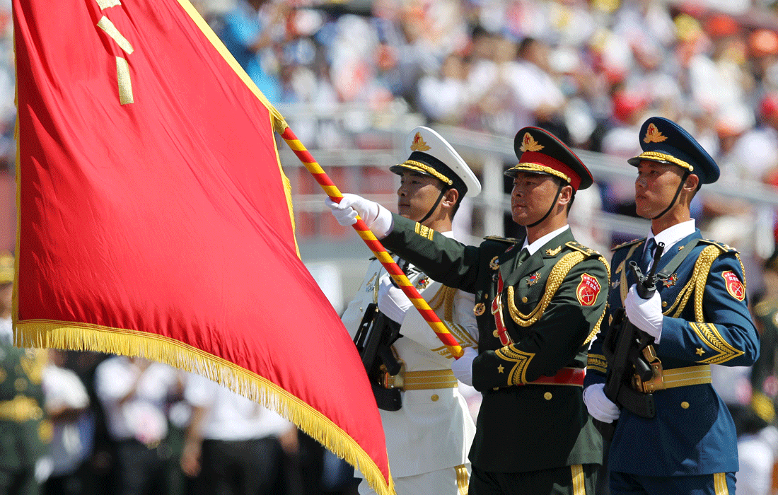 Three-Service honor guards – one each from the Chinese army, navy and air force – pass Tiananmen Square with a PLA army flag. figcaption >