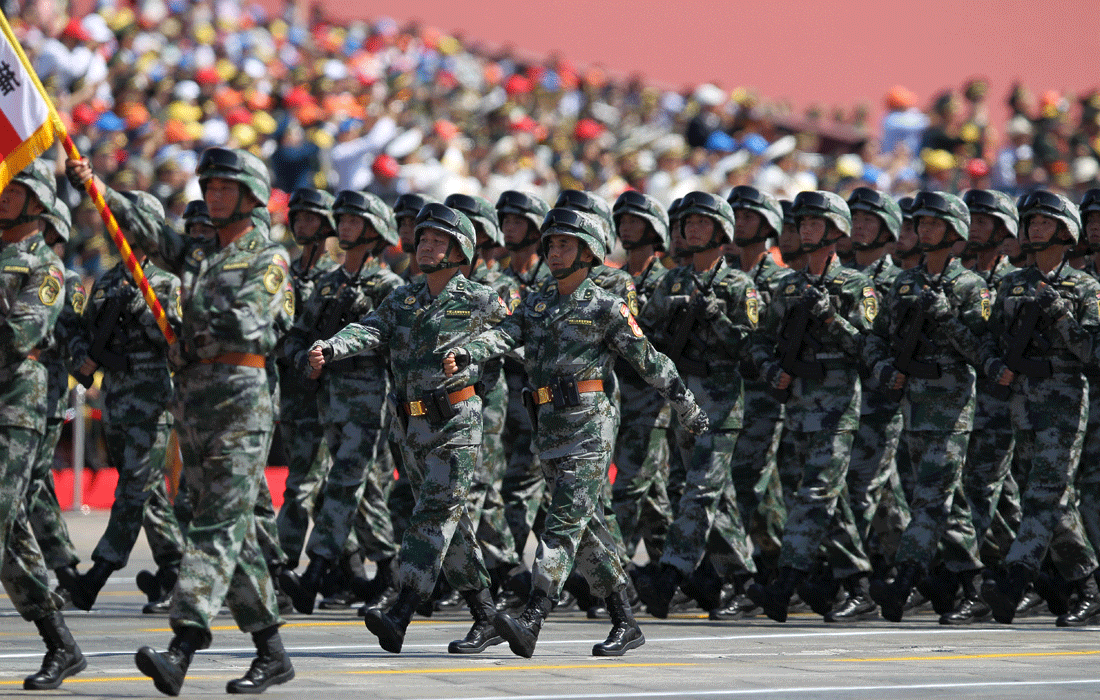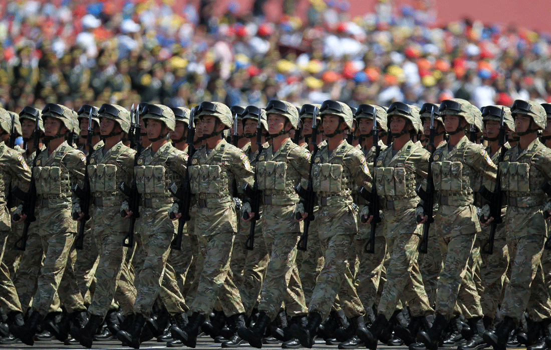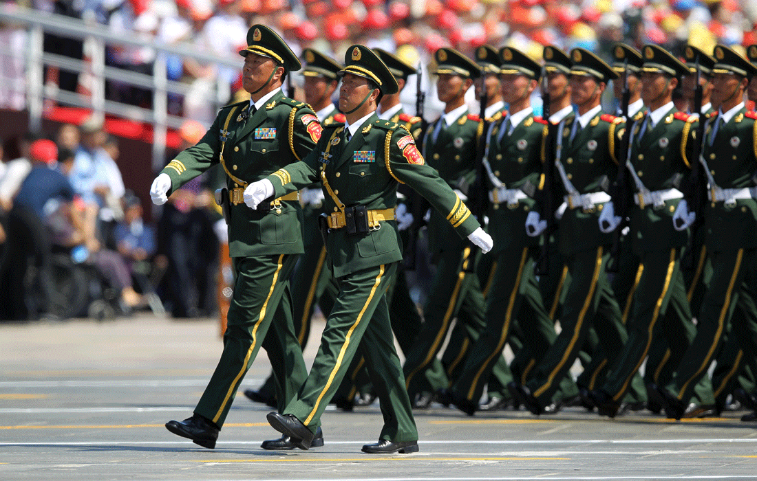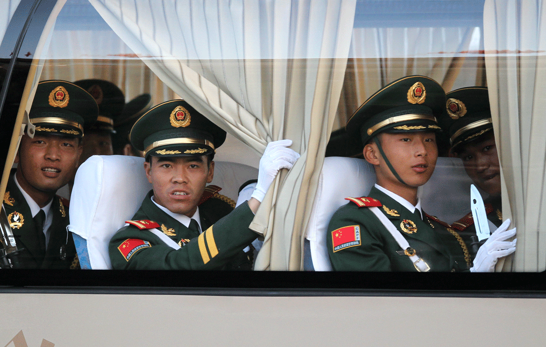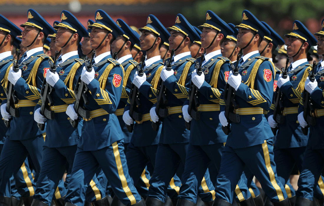 Three-Service honor guards – one each from the Chinese army, navy and air force – pass Tiananmen Square with a PLA army flag. figcaption >