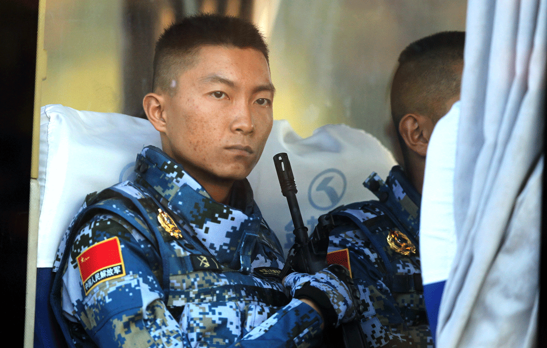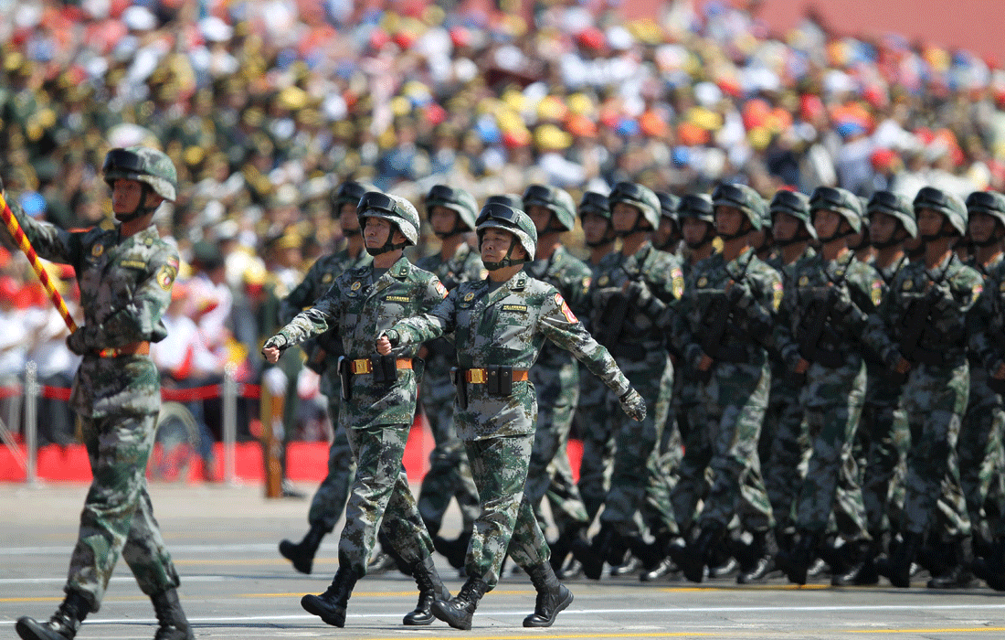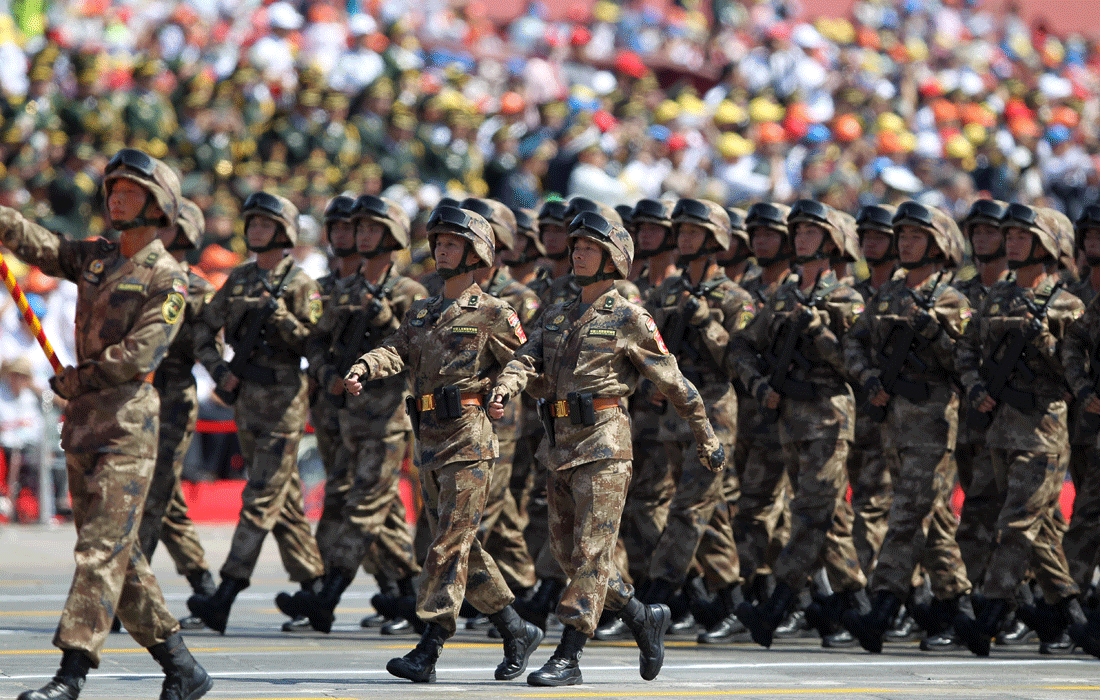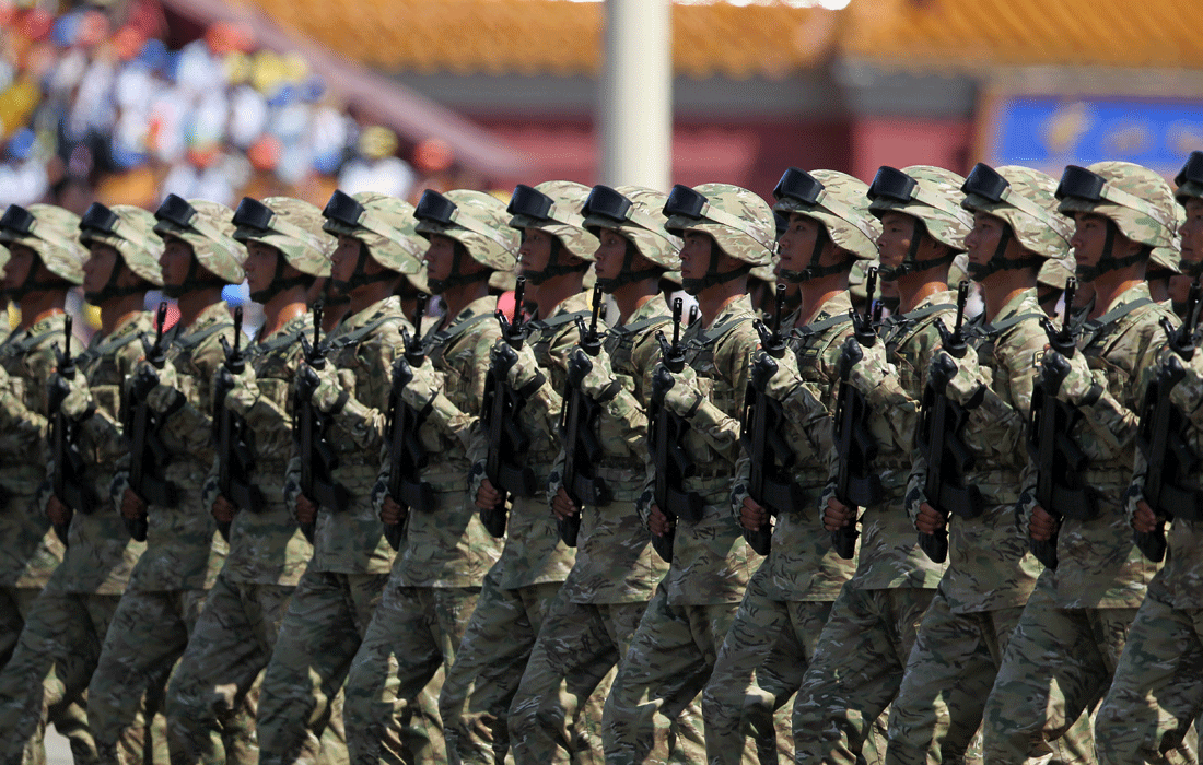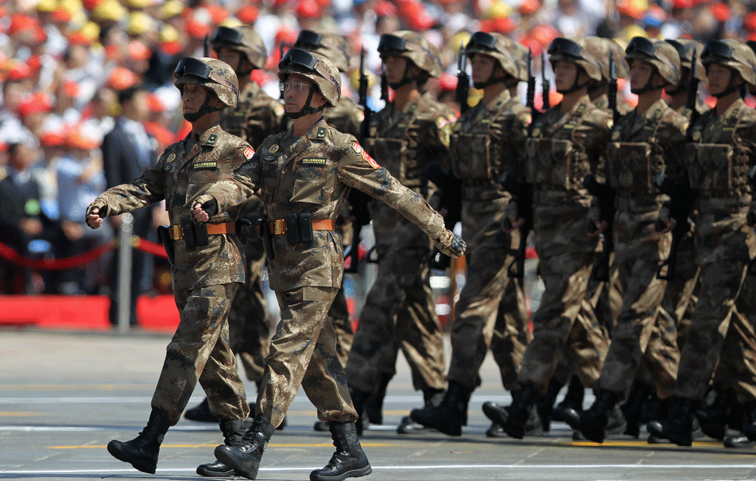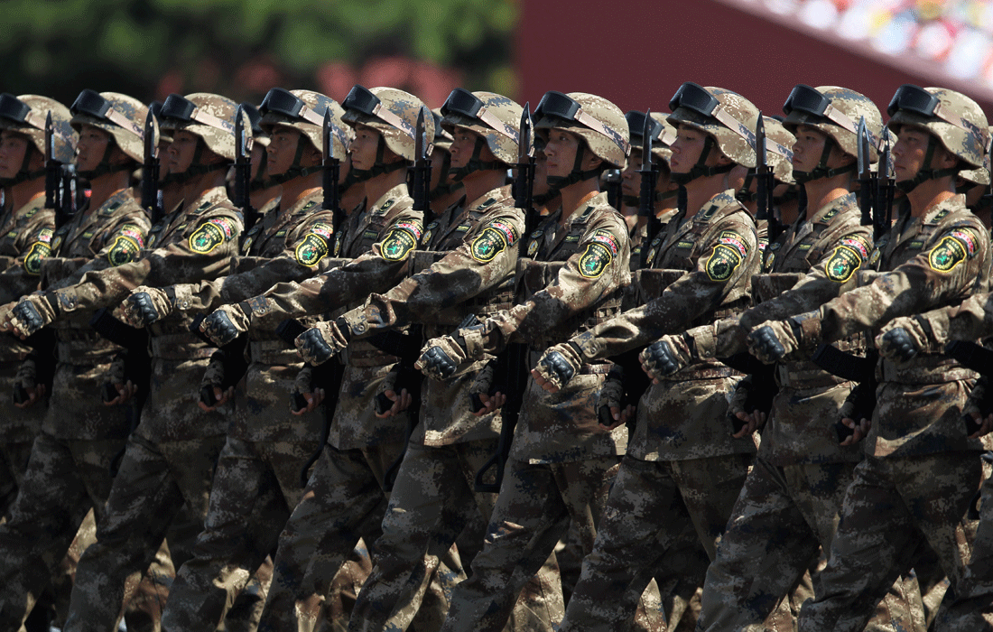 Three-Service honor guards – one each from the Chinese army, navy and air force – pass Tiananmen Square with a PLA army flag. figcaption >