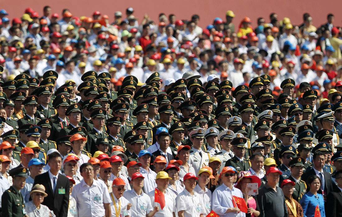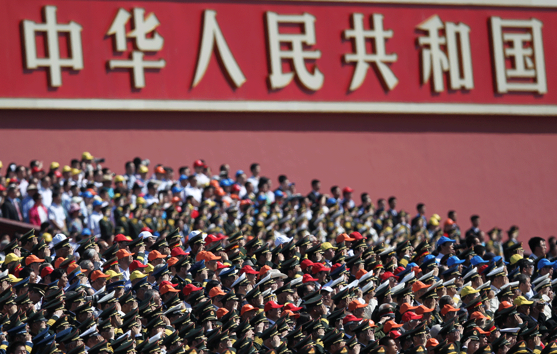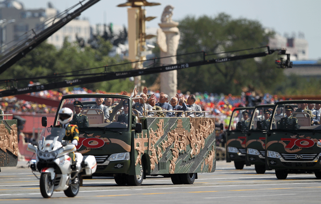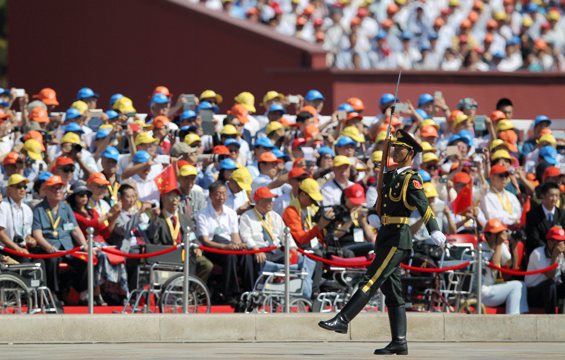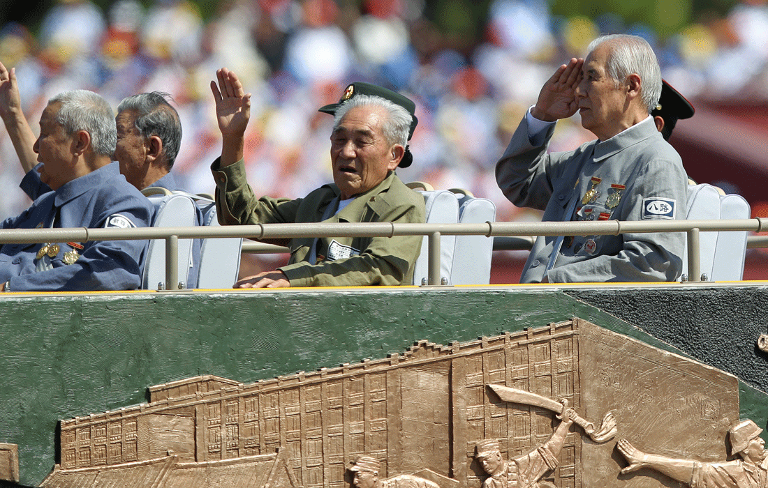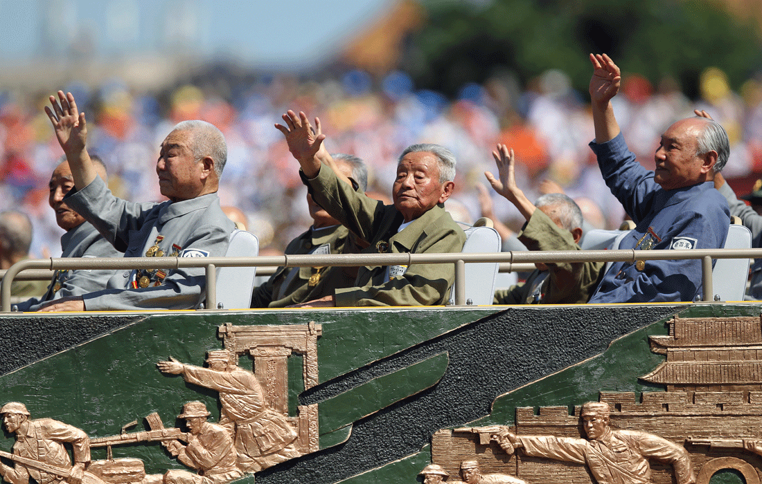 Veterans of the War of Resistance Against Japanese Aggression pass by Tiananmen Square. figcaption >