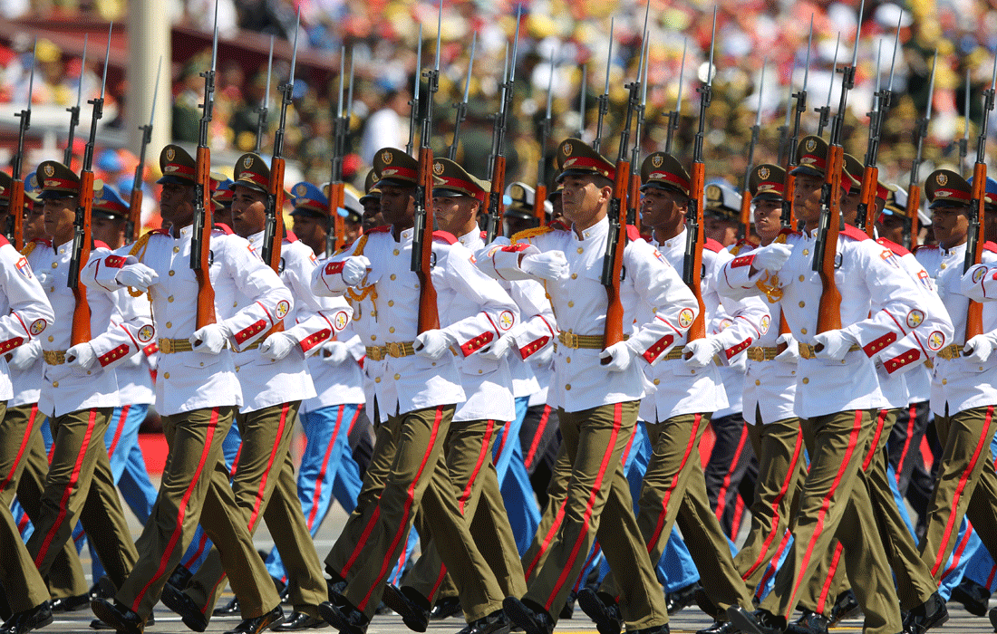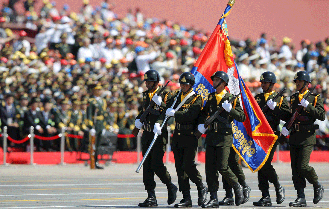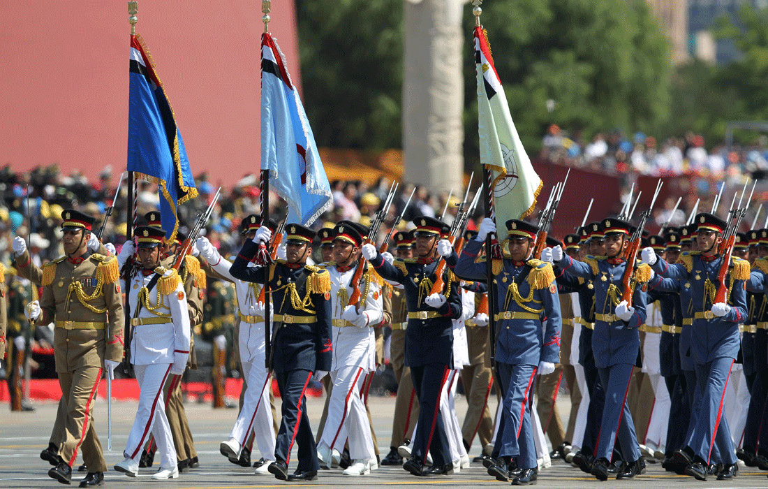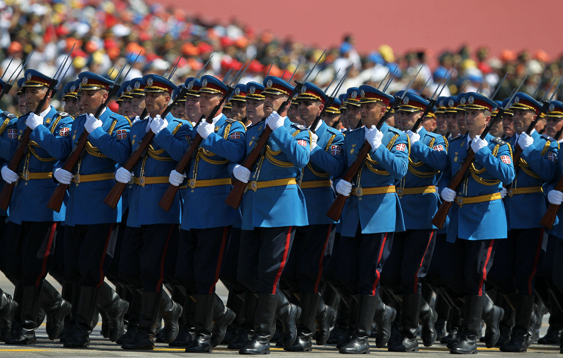 A foreign troop formation, one of many that took part in the parade, passes by Tiananmen Square. figcaption >