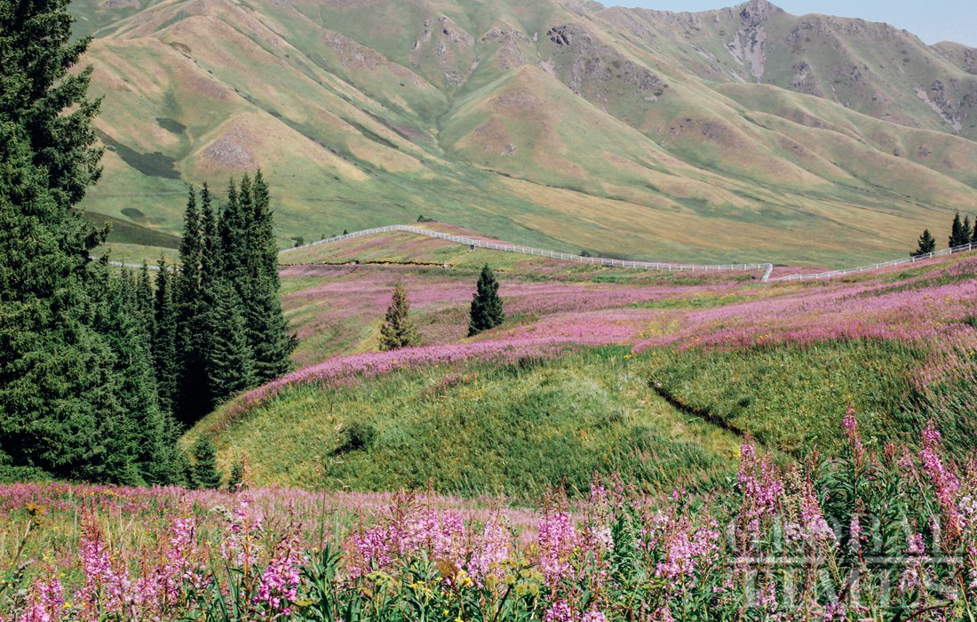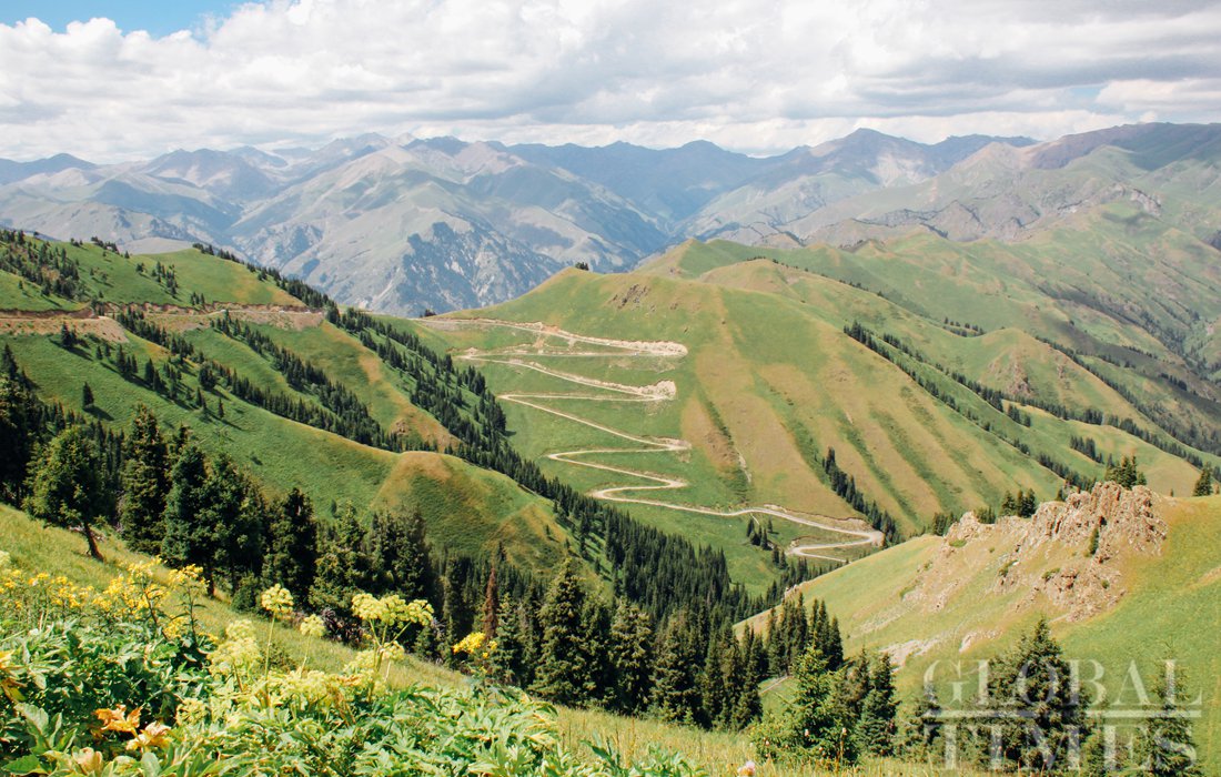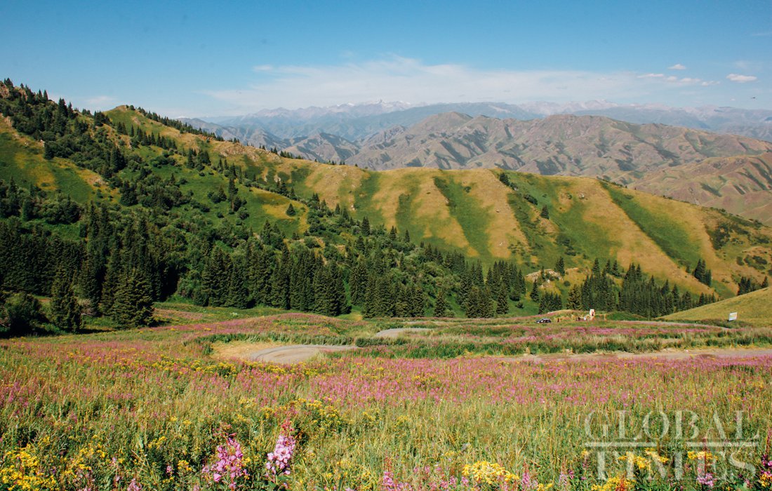 Xiaerxili blooms with colorful wildflowers that climb the green mountain. Green pine trees offer shade and contrast to the colorful, blooming flowers. Photo: Shan Jie/GT figcaption >