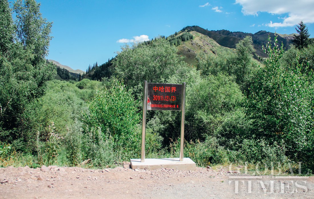 A sign marks the border between China and Kazakhstan. Photo: Shan Jie/GT figcaption >