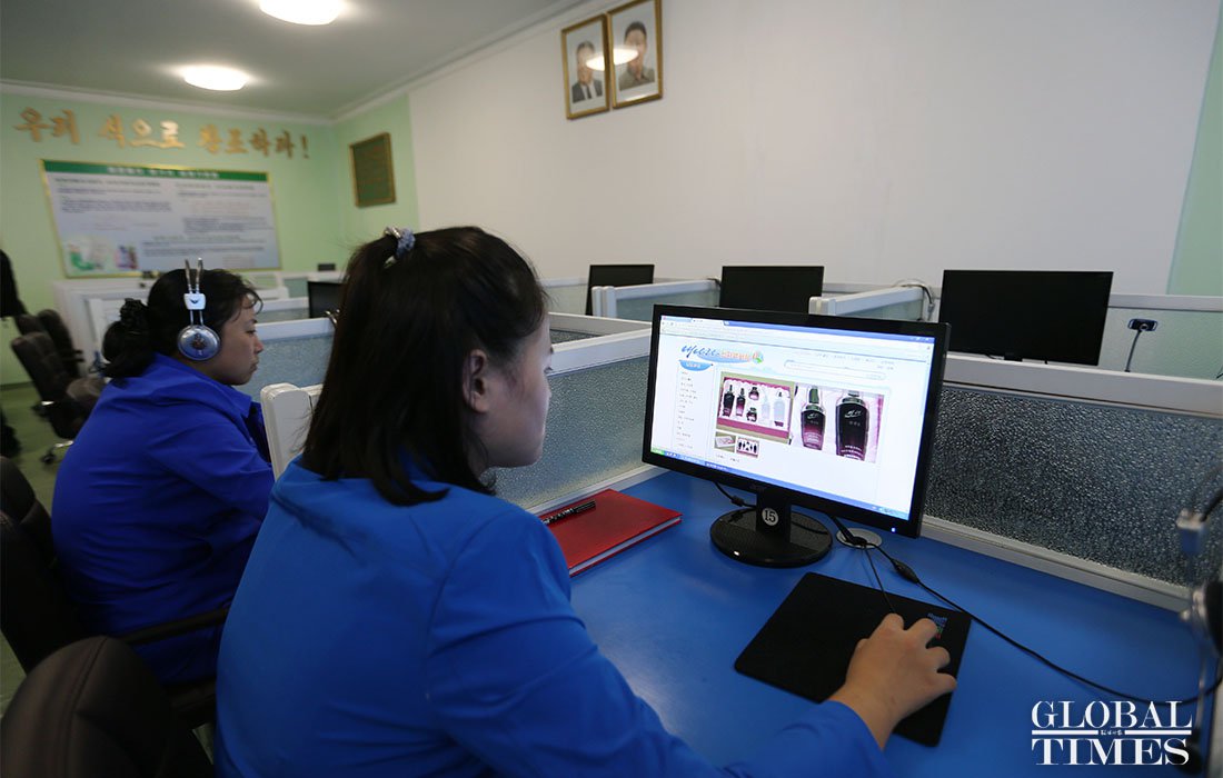 Factory workers post cosmetics information online in a multimedia room. figcaption >