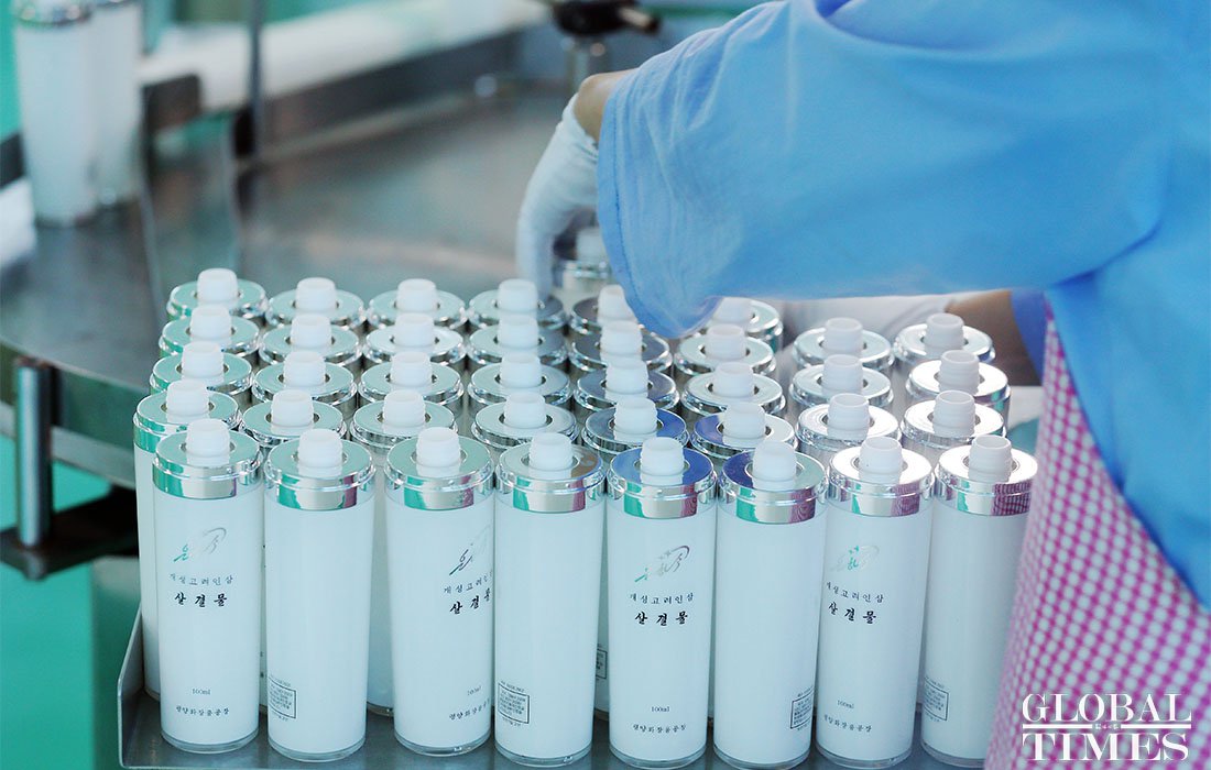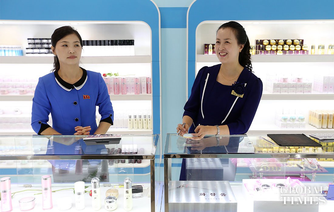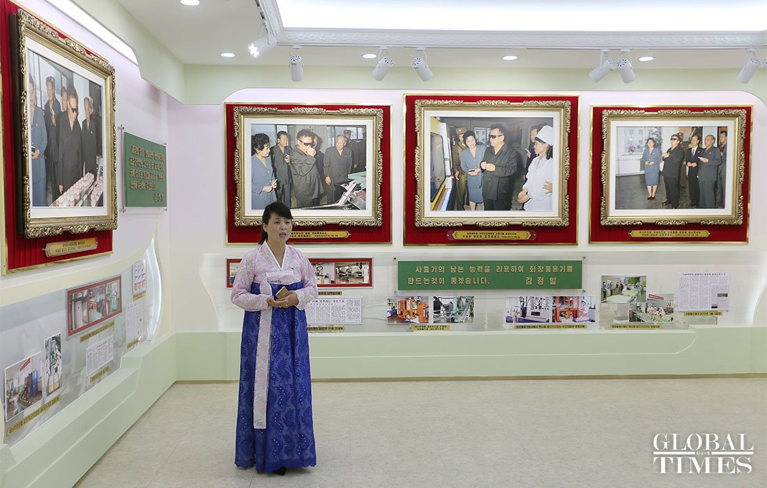 An interpreter explains how much DPRK leaders care about Pyongyang Cosmetics Factory to visitors in a memorial hall on September 8. Photos: Cui Meng/GT