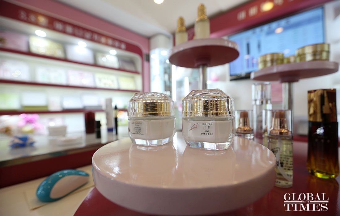 Two workers sell cosmetics at an exclusive store set up by the factory to sell its products. figcaption >