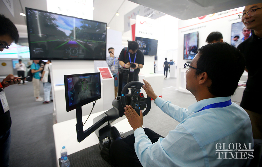 A visitor tries an autopilot system. Photo: Yang Hui/GT figcaption >