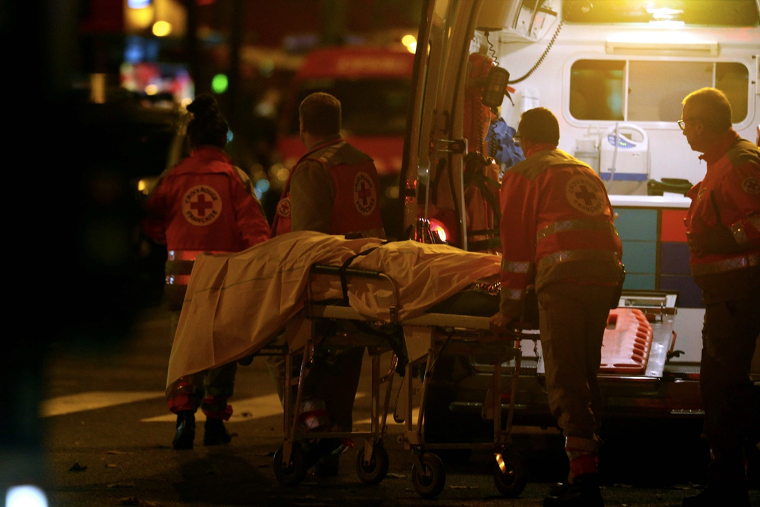 Paramedics remove bodies from outside the Bataclan concert hall after an attack on November 13, 2015 in Paris, France. According to reports, over 150 people were killed in a series of bombings and shootings across Paris, including at a soccer game at the Stade de France and a concert at the Bataclan theater. Photo: CFP/ Xavier Laine/Getty Images