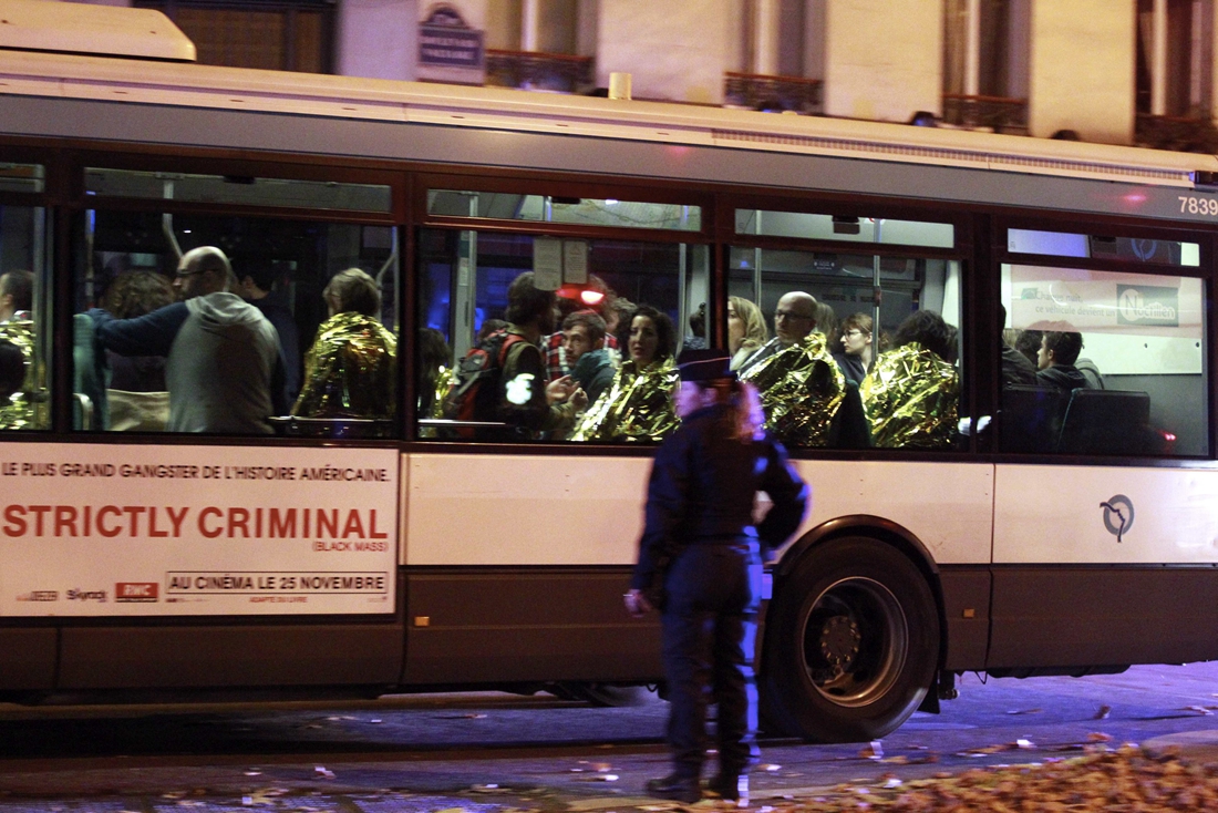 Survivors ride a bus to the hospital following an attack on the Bataclan concert hall on November 13, 2015 in Paris, France. According to reports, over 150 people were killed in a series of bombings and shootings across Paris, including at a soccer game at the Stade de France and a concert at the Bataclan theater. Photo: CFP/ Xavier Laine/Getty Images figcaption >