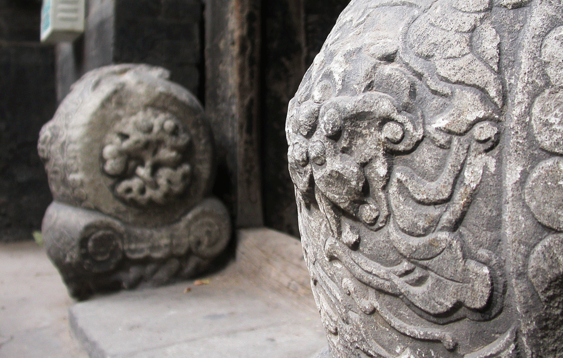 Pictured is a pair of gate piers. These carved stones are both decorative and help support the wooden door frames used in traditional courtyard homes. They are not only an important architectural element, but their designs reveal the status or occupation of their former owners. figcaption >