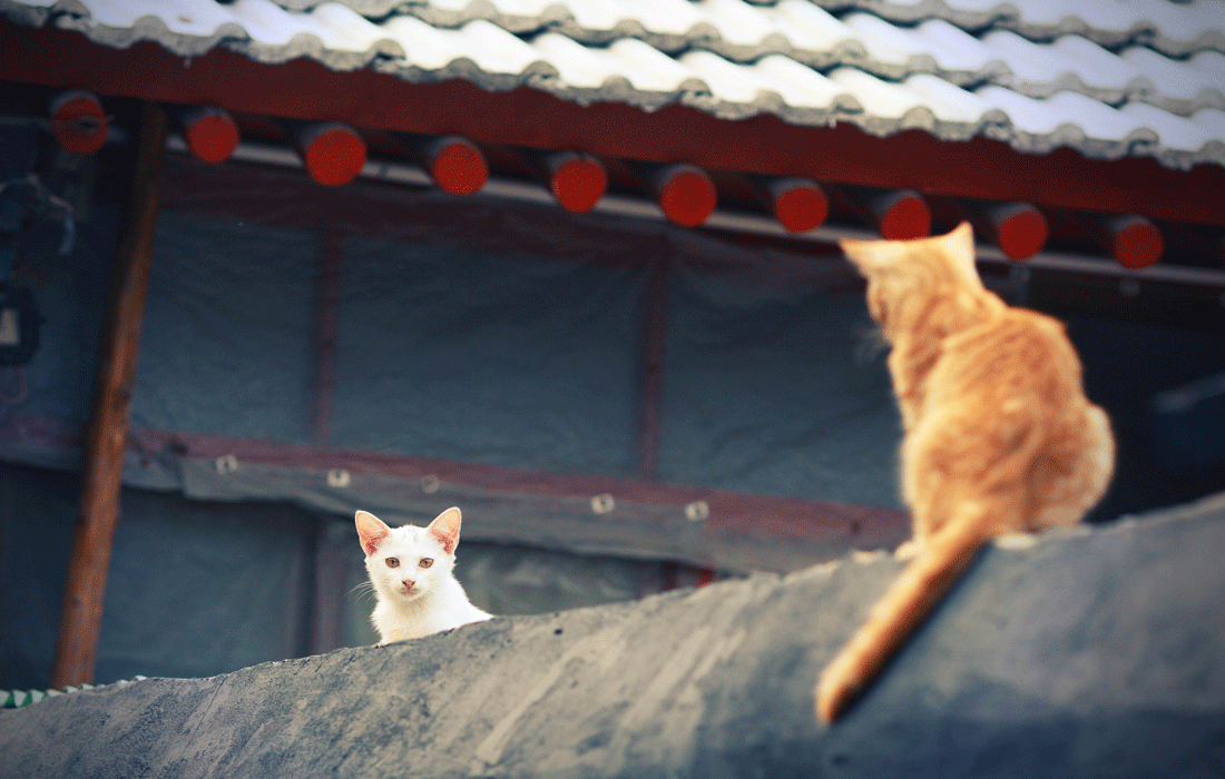 Two cats sit on a tile roof in the hutongs. figcaption >