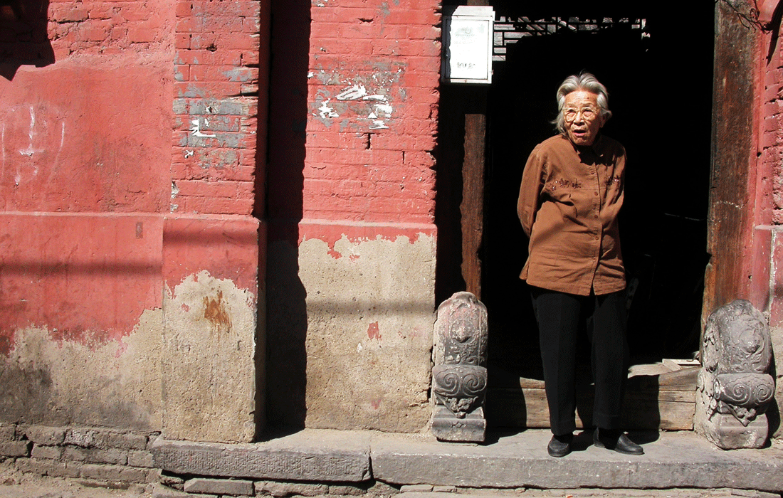 An old woman stands at the gate of a traditional hutong courtyard. Once filled with hutongs, in recent decades Beijing has seen its distinctive architecture disappear under the wrecking ball to make way for apartment blocks. Beijingers whose families have lived in the hutongs for generations are sometimes reluctant to leave. figcaption >