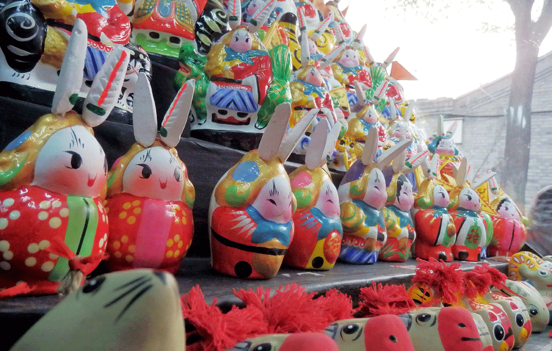 Pictured are colorful ceramic figurines of a famous hutong resident. “Tu’er Ye,” also known as the “Lord Rabbit”, is a Beijing folk deity with roots in moon worship and is a symbol of good luck. figcaption >