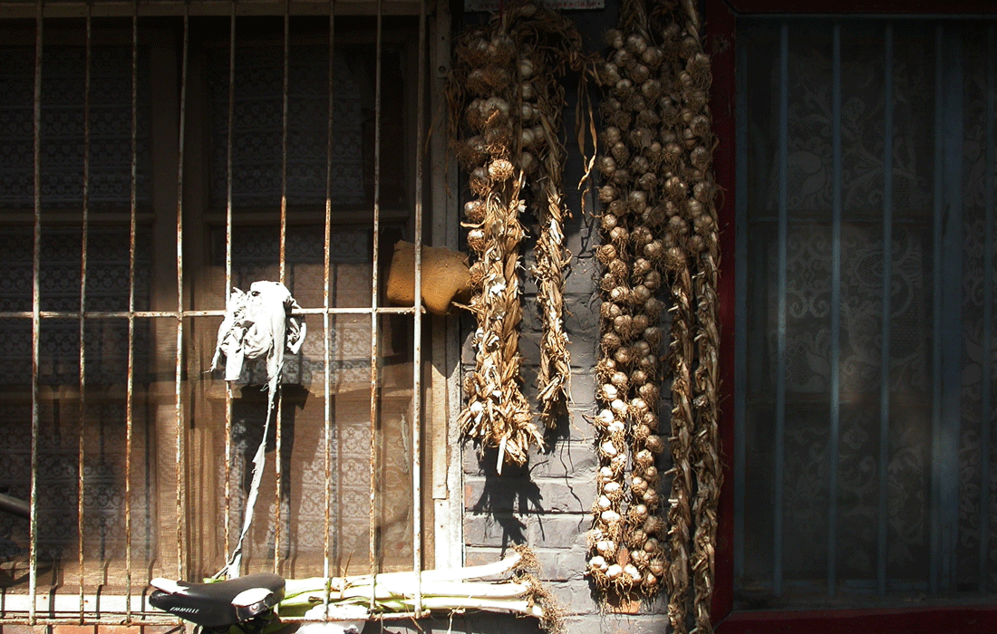 Several braids of garlic hang on a wall outside the window of a hutong residence. Also used for cooking, the thick braids are traditionally hung outside doors in the belief they help ward off evil spirits. figcaption >