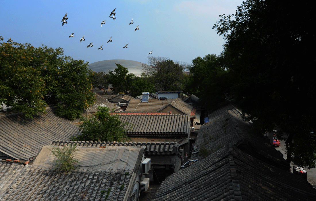 A flock of pigeons flies over traditional rooftops in a hutong. The National Center for the Performing Arts, or “The Egg,” is visible in the background. figcaption >