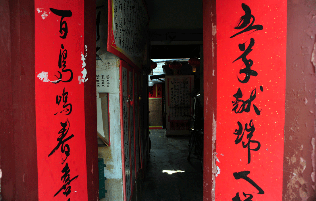 A Chinese New Year tradition, posted couplets bearing messages of fortune and good luck around doors remind their residents of good things when leaving or returning home. figcaption >
