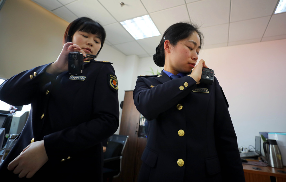 Two female urban management officers put on body cameras before going on patrol. Photo: Yang Hui/GT figcaption >