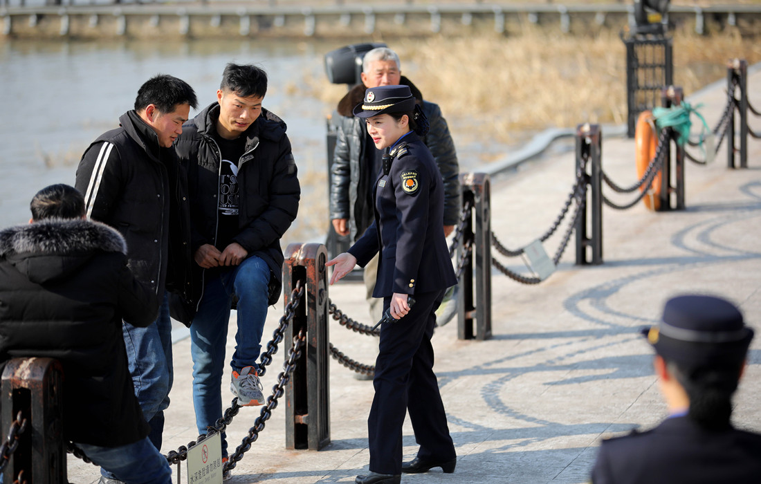 A female urban management officer reprimands people from stepping over the protective rails nearby the river. Photo: Yang Hui/GT figcaption >