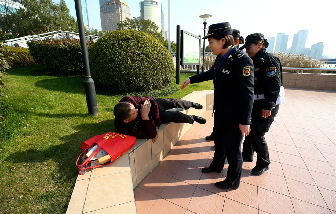 Female urban management officers remind a man not to sleep on the street. Photo: Yang Hui/GT figcaption >
