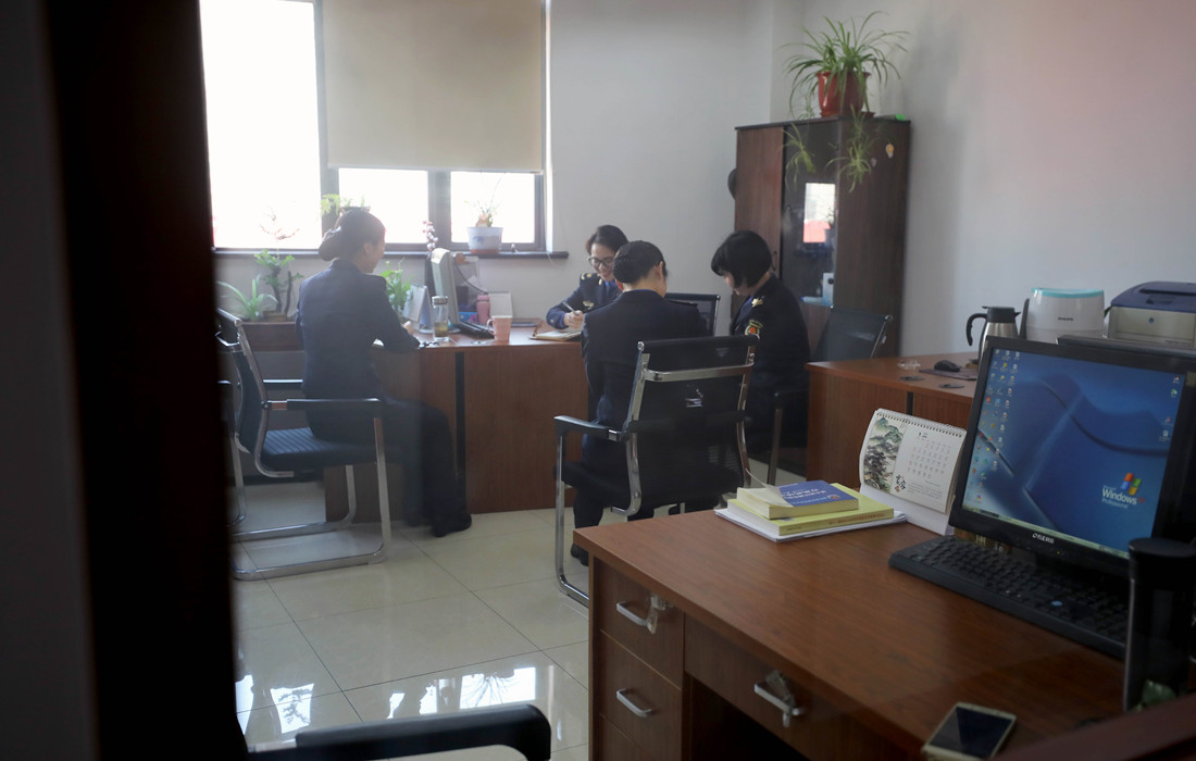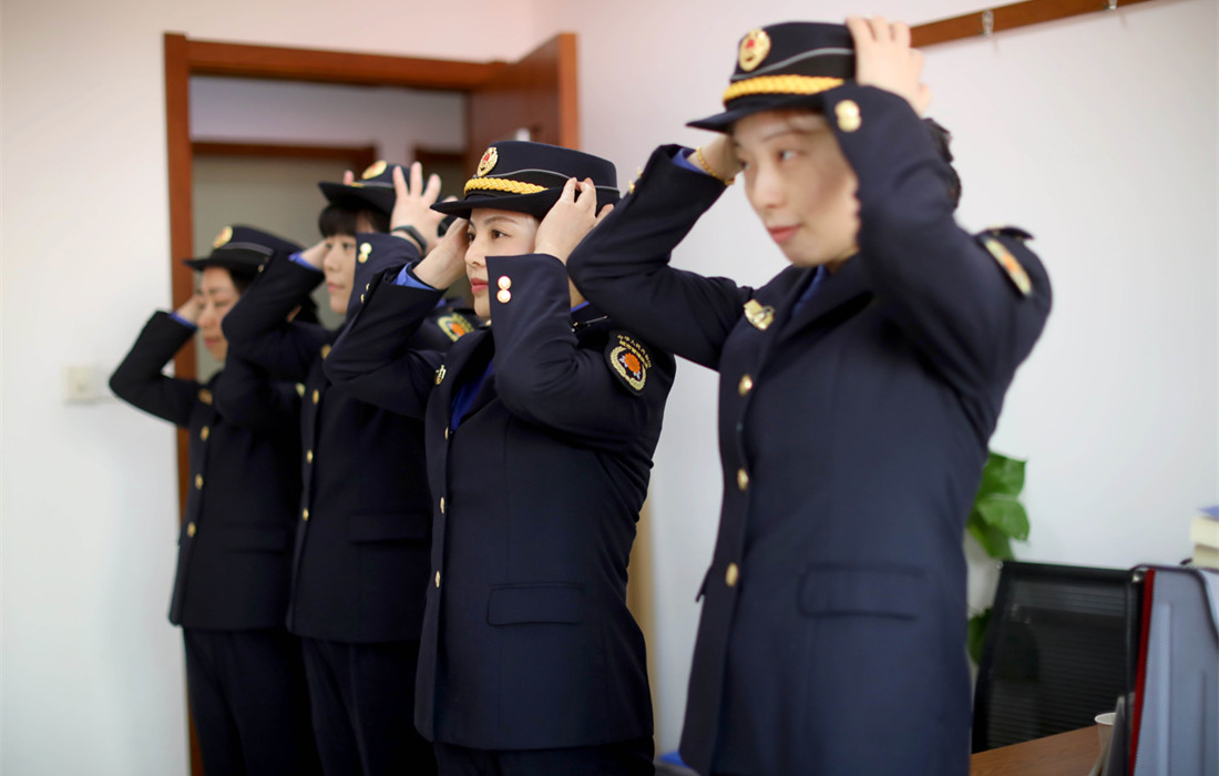 Female urban management officers make sure their appearances are tidy before going out on patrol. Photo: Yang Hui/GT figcaption >