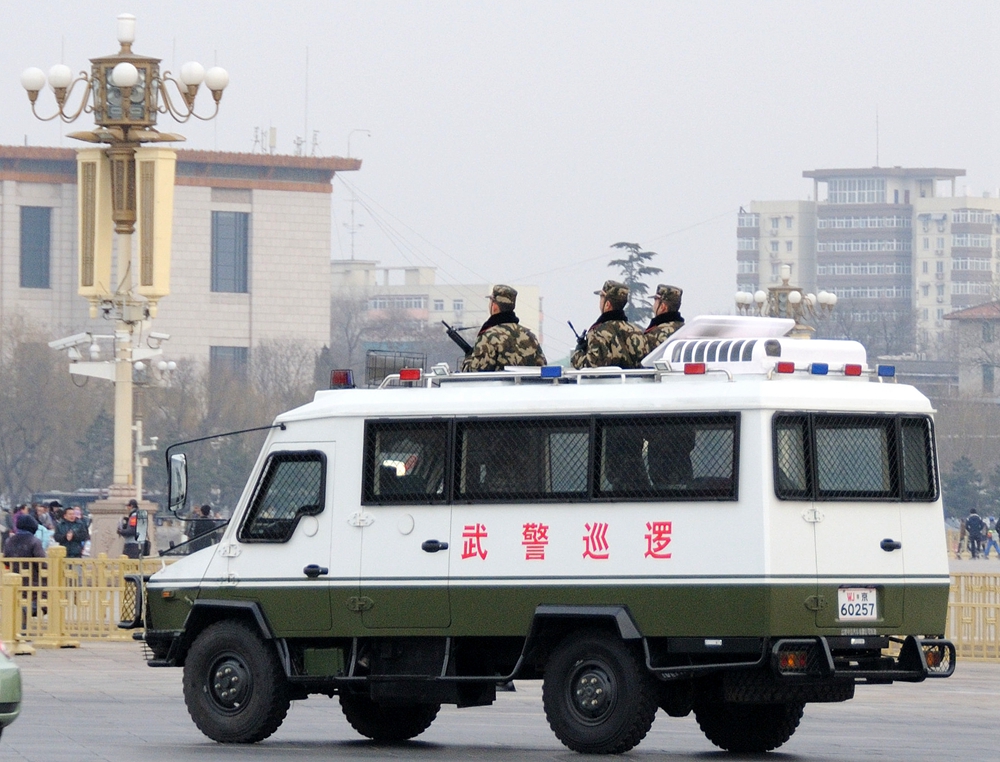 Policemen patrol Tiananmen Square in Beijing on February 29. China’s armed police, SWAT teams and other police units stepped up patrols around the area ahead of the two sessions. The annual meetings of National Committee of the Chinese Political Consultative Conference (CPPCC) and the National People's Congress (NPC) will open on March 3 and March 5 respectively. Beijing Municipal Police Bureau dispatched an average 26,000 policemen a day during the two sessions in 2015, according to people.com.cn. Photo: CFP
