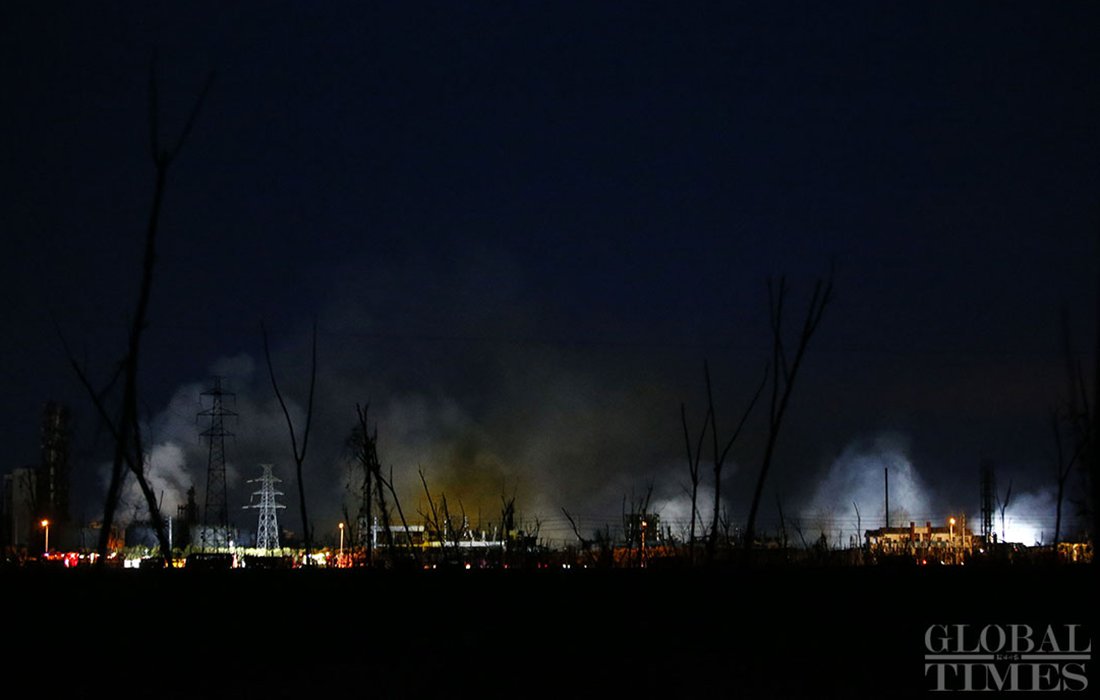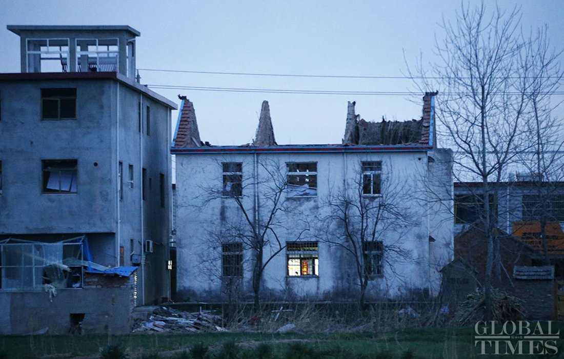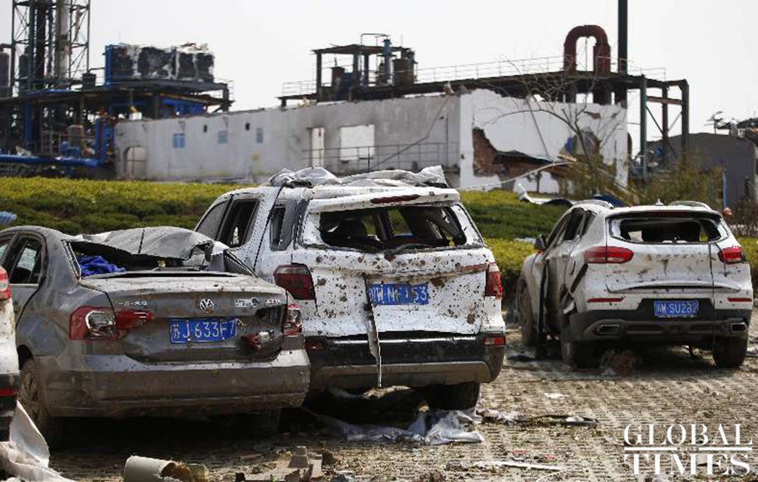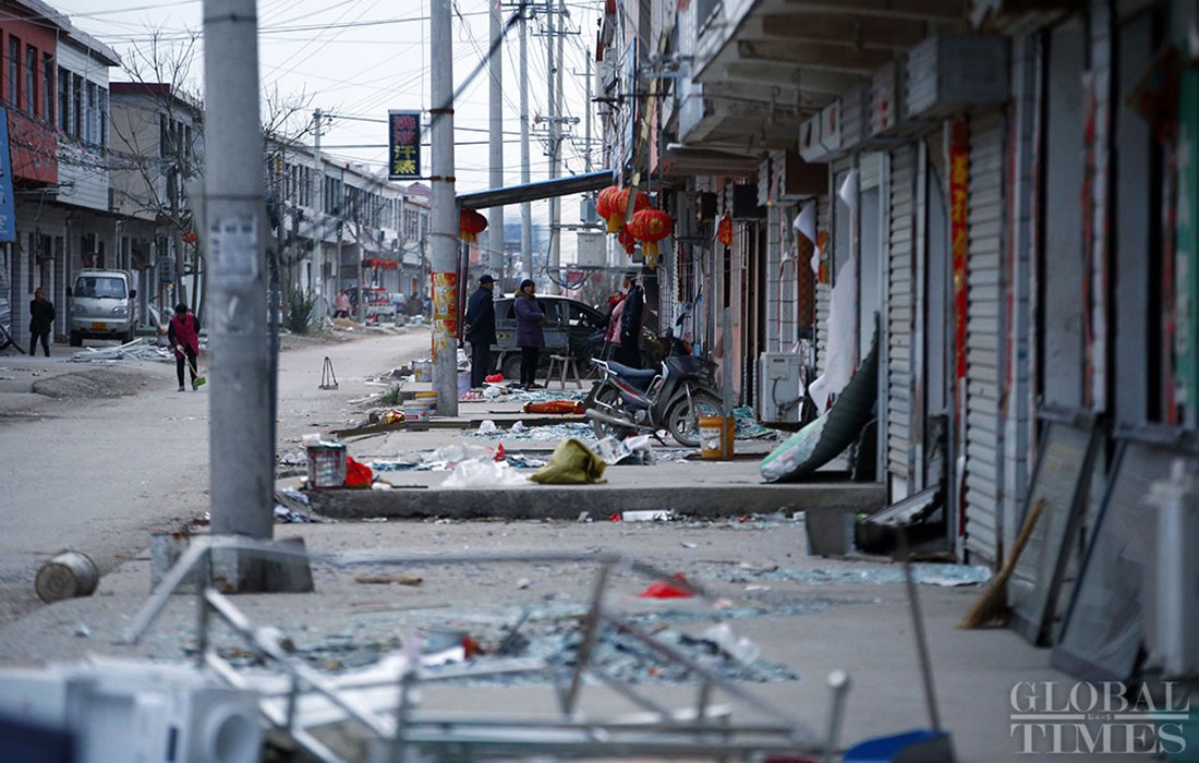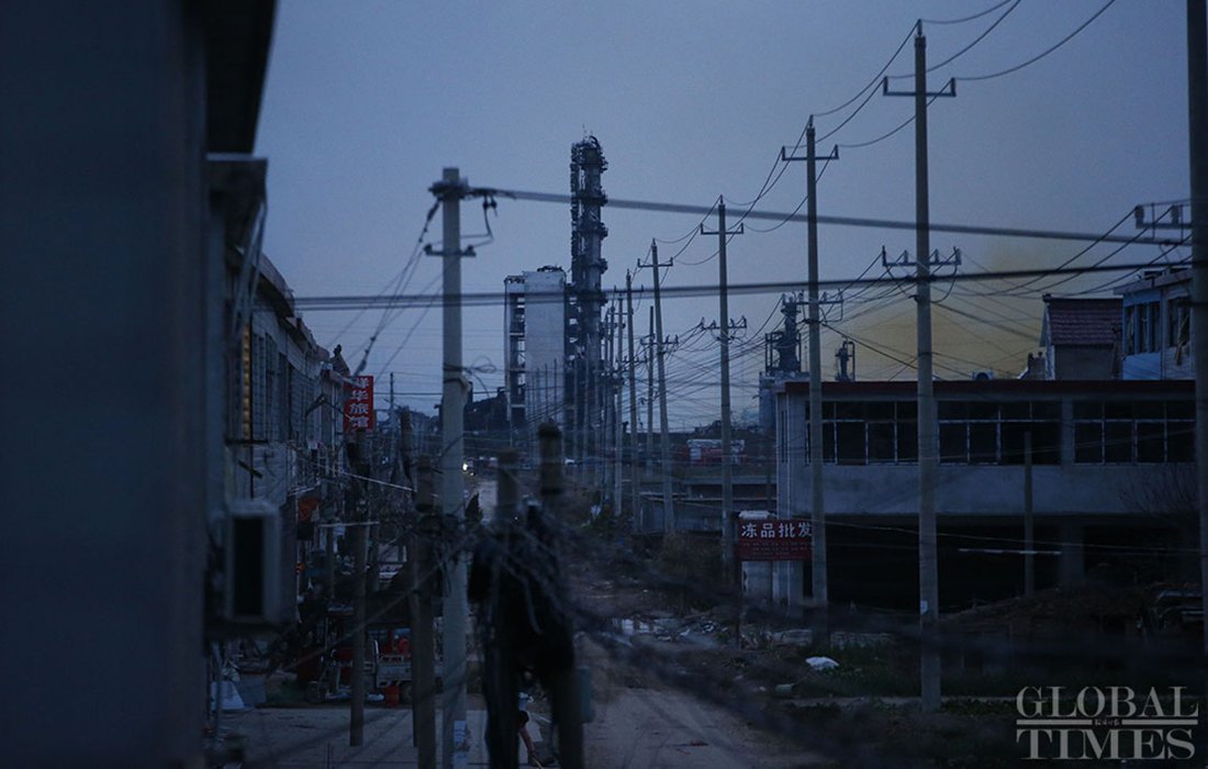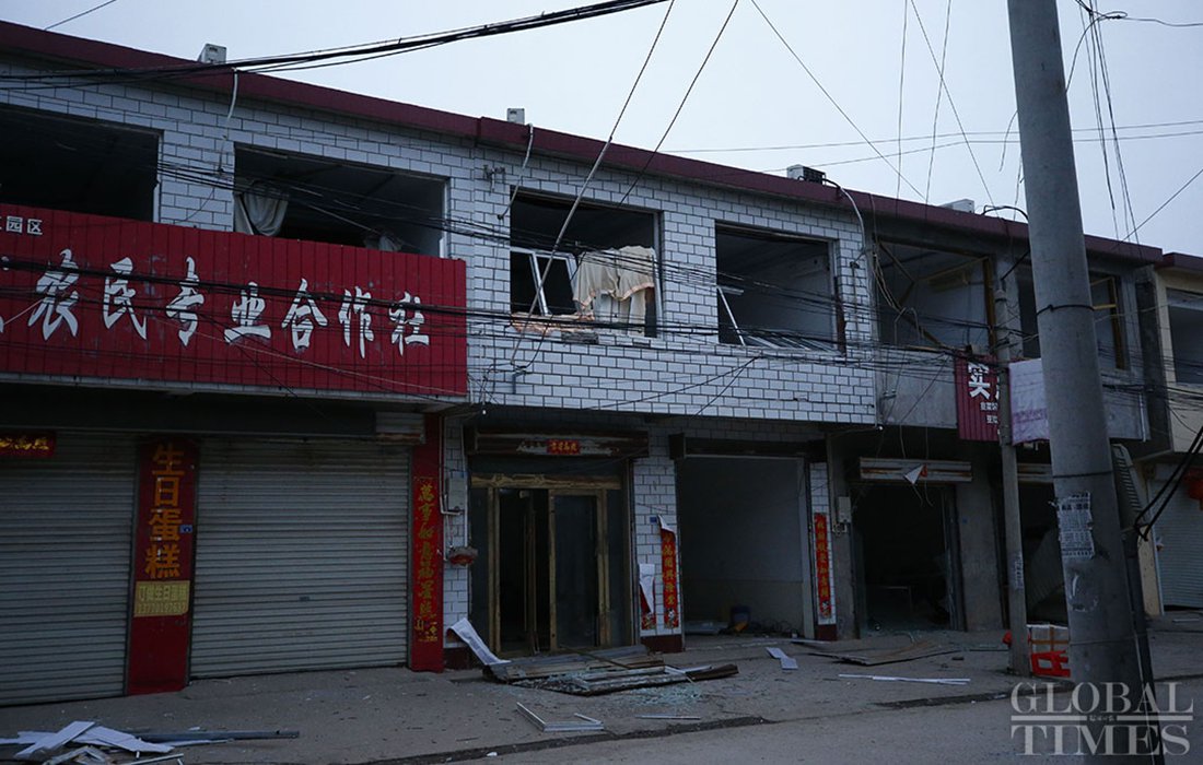 Photos taken on March 22, 2019, show that many houses in Wangshang village, the nearest village to the chemical explosion area in Xiangshui, East China’s Jiangsu Province, are damaged. The roads to the chemical plant are blocked and the plant is smoking at 6 pm local time. An explosion in the chemical plant on March 21 kills at least 62 people.