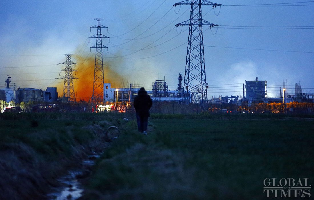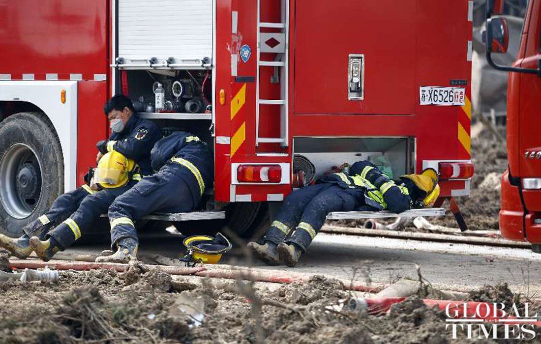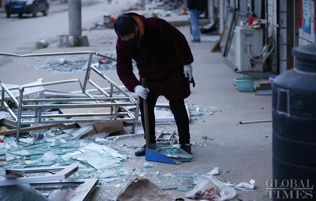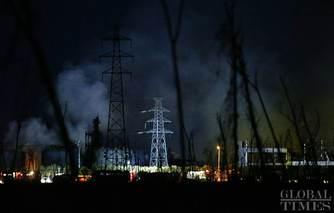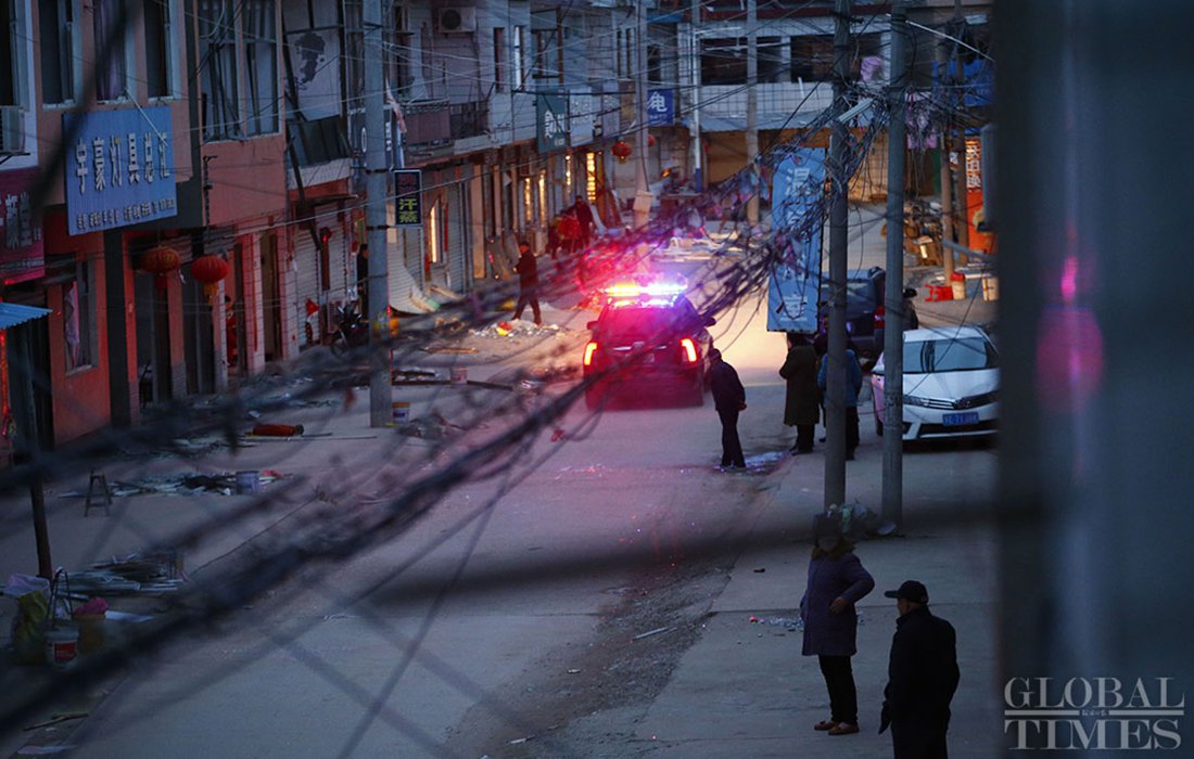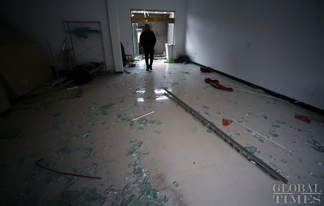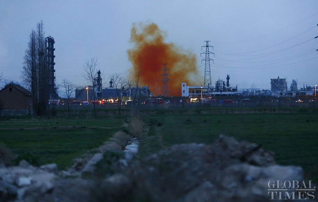 Photos taken on March 22, 2019, show that many houses in Wangshang village, the nearest village to the chemical explosion area in Xiangshui, East China’s Jiangsu Province, are damaged. The roads to the chemical plant are blocked and the plant is smoking at 6 pm local time. An explosion in the chemical plant on March 21 kills at least 62 people.