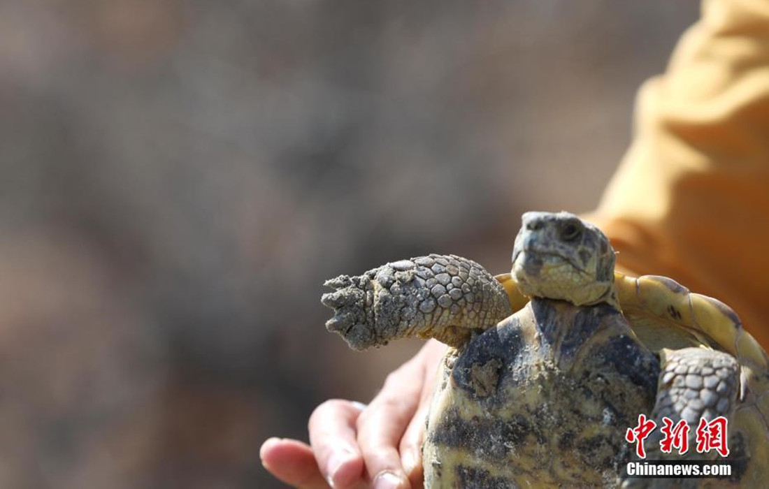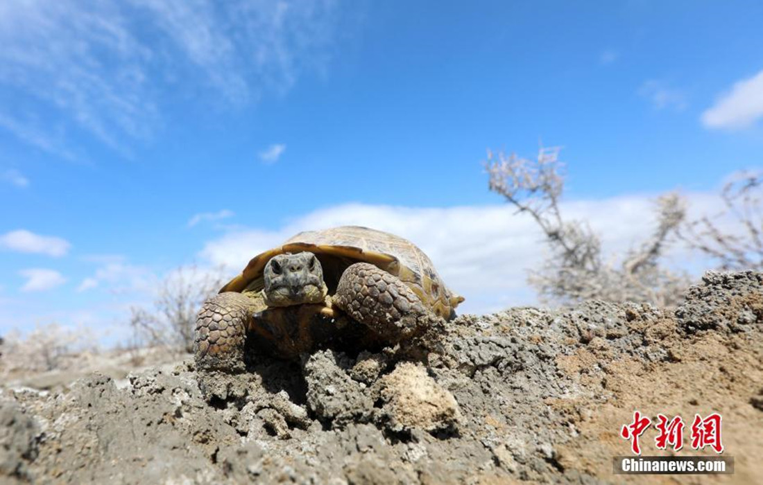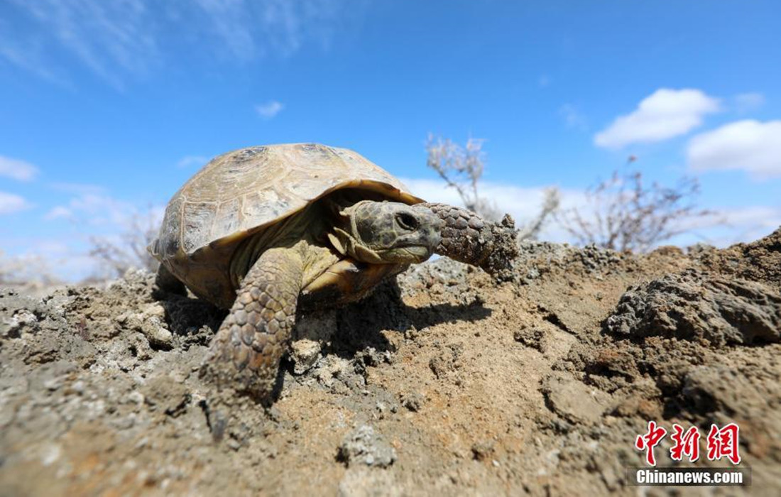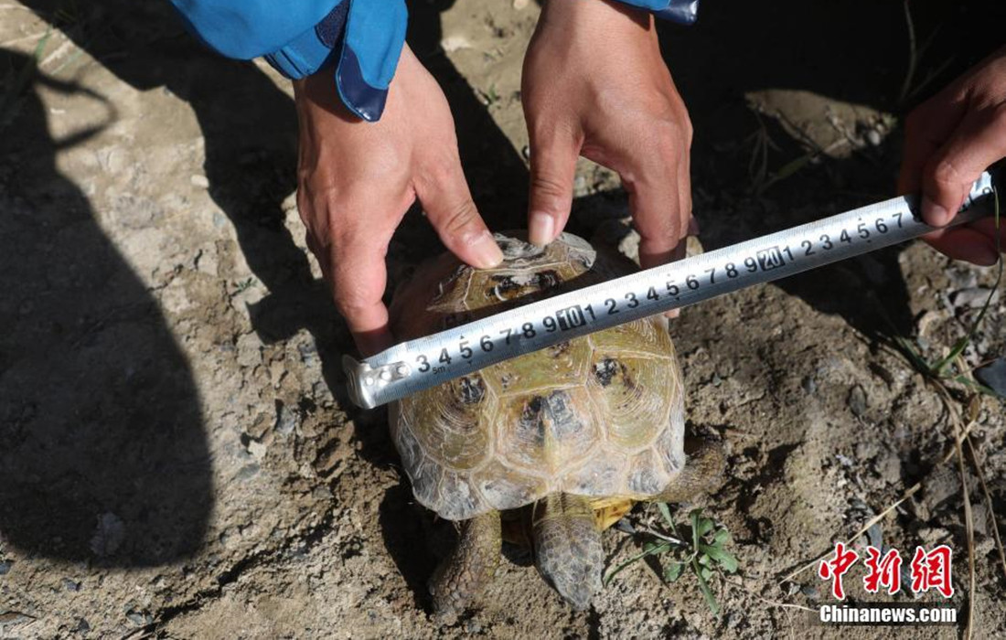 A first-class state-protected steppe tortoise turned up at a wetland nature reserve in Northwest China’s Xinjiang Uyghur Autonomous Region on April 23, 2019. The male tortoise is aged somewhere in its twenties or thirties according to the staff in the reserve. The animal was examined before release. (Photos: Chinanews.com)
