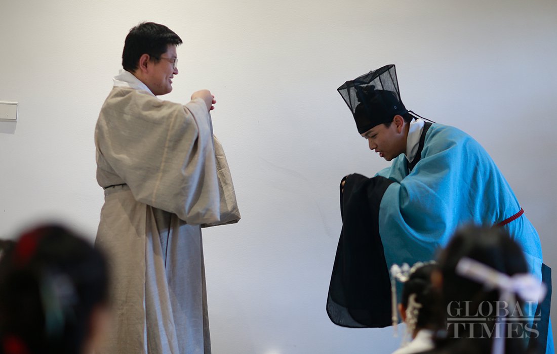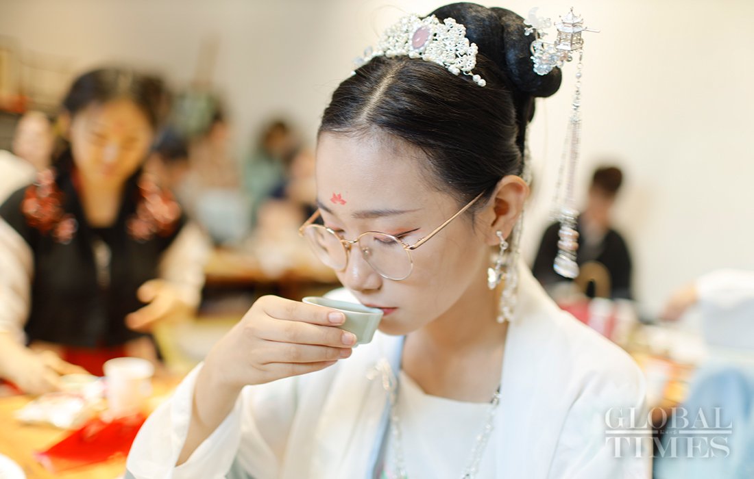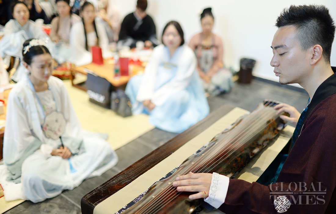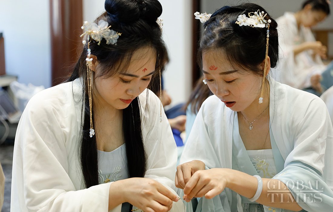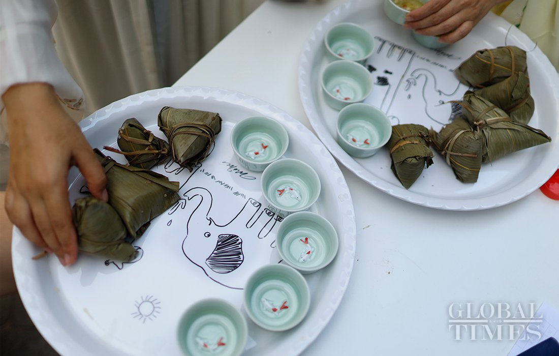 During the event, the group members experienced the traditional Chinese culture by smearing realgar cream, listening to ancient zither music, making scented sachets and playing pitch-pot game. Photos: Li Hao/GT