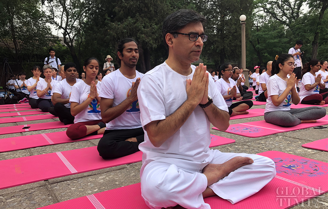 Hundreds yoga enthusiasts take part in the 5th International Yoga Day celebrations in Beijing on Friday organized by the Embassy of India, China. (Photos: Chen Xi、Liao Qiao/GT)