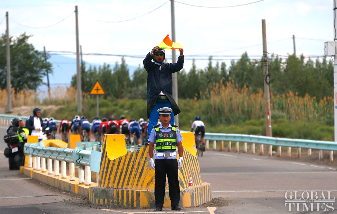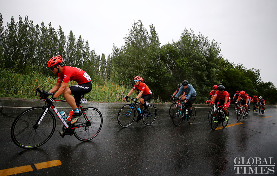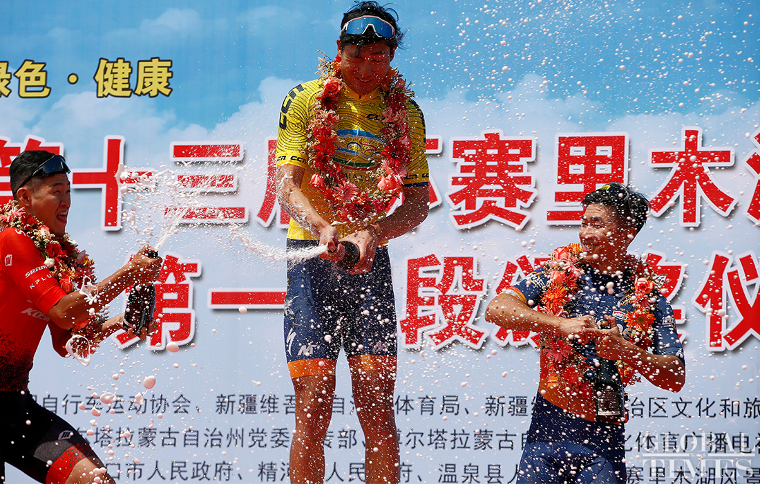 A total of 163 cyclists divided into 30 teams are competing in this five-day event. On the course of this highly challenging race, participants will endure through a 468-kilometer route crossing mountains, the Gobi desert, lakes and grasslands. Liu Zhuqing from TEAM MAGENE-ZhaoMeng sports won the first prize in the first leg of this race.