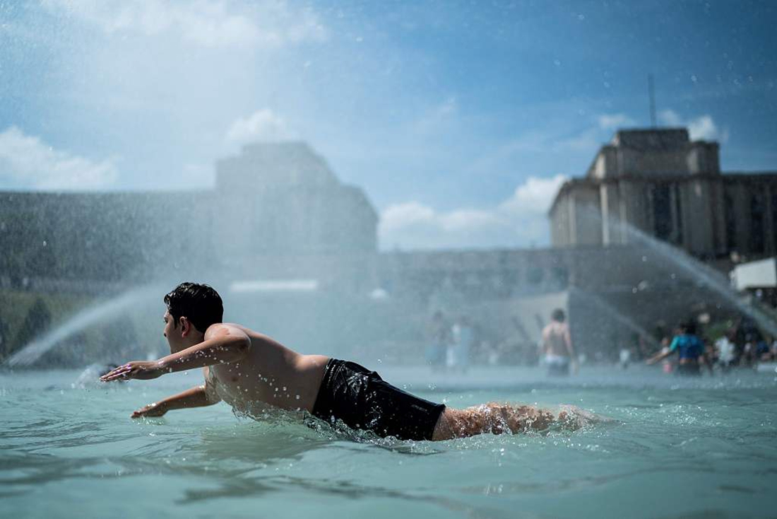 A teenager swims in the fountain of the Trocadero esplanade in Paris on June 25, 2019, the Palais de Chaillot can be seen on the background. Photo:Kenzo TRIBOUILLARD/VCG figcaption >