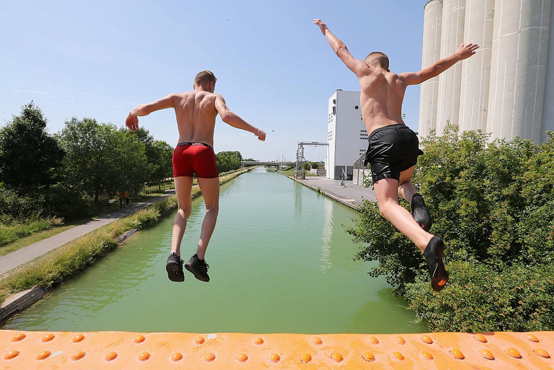 Boys jump into the canal near Reims, northeastern France, as temperature soars to unbearable limits on June 25, 2019. Photo: FRANCOIS NASCIMBENI/VCG figcaption >