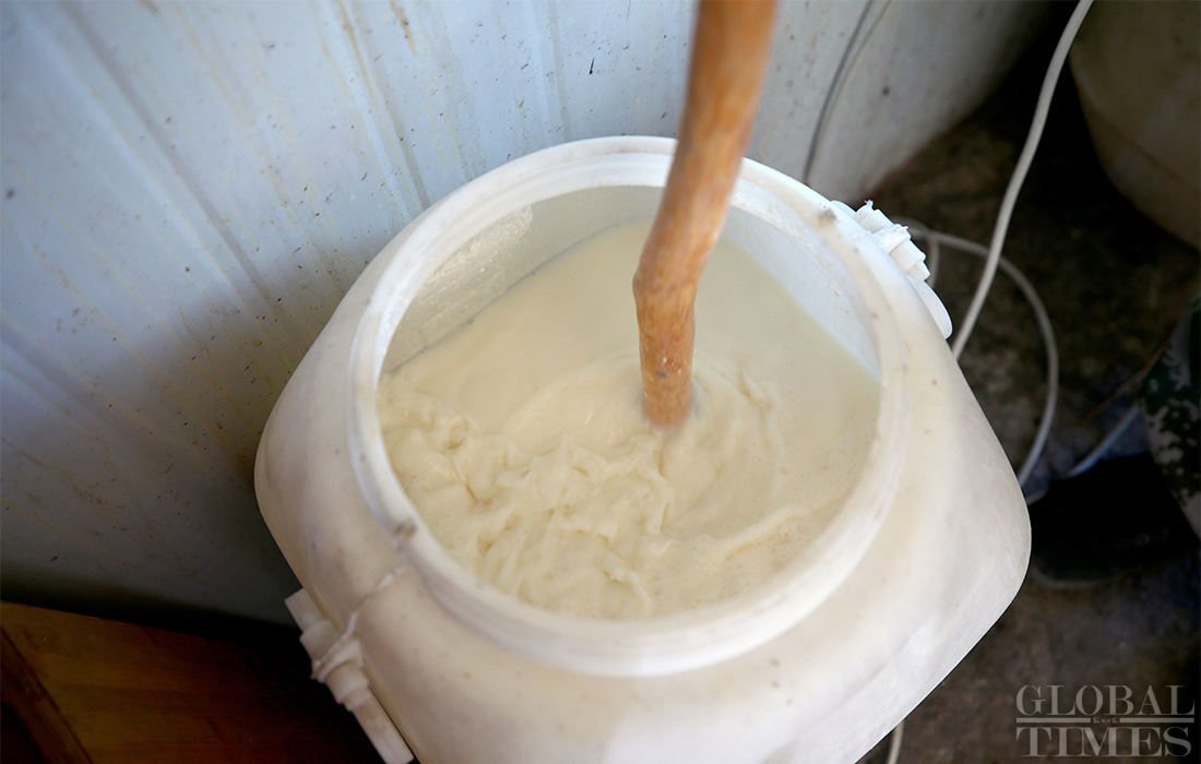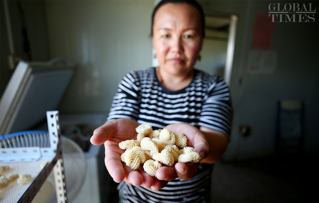 A villager in Wenquan county shows her homemade dairy products. Photo: Yang Hui/GT figcaption >