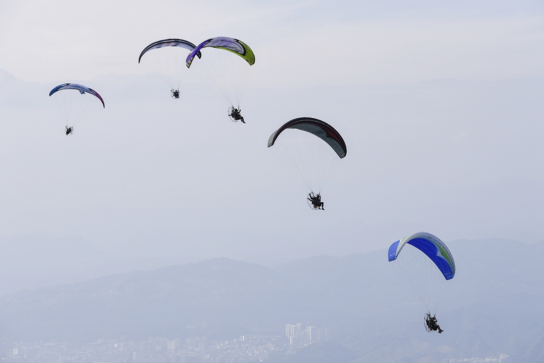 Competitors of the Paramotor Air Games fly their aircrafts above Zhangjiajie City in China’s Hunan Province on June 26, 2019. Photo: VCG figcaption >