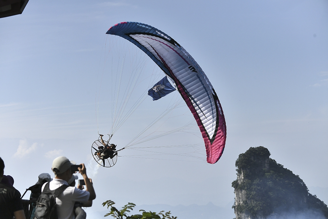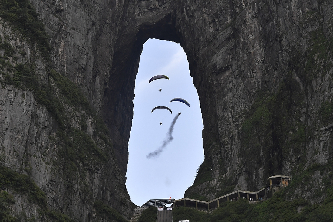A competitor of the Paramotor Air Games enthralls spectators while flying above the Tianmen Mountain in Zhangjiajie City, China’s Hunan Province on June 26, 2019. Photos: VCG