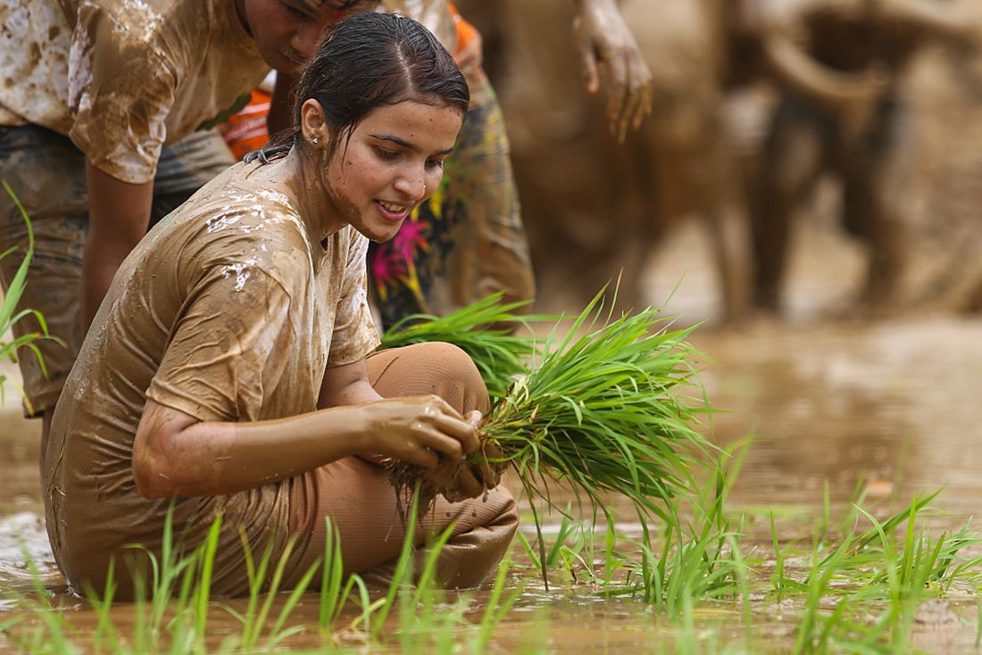 A woman covered in mud, plants rice saplings in a paddy field during the National Paddy Day celebration at the Dhunibesi Muncipality, in Dhading, Nepal on June 30, 2019. Photo: Sunil Pradhan / Sputnik /VCG figcaption >