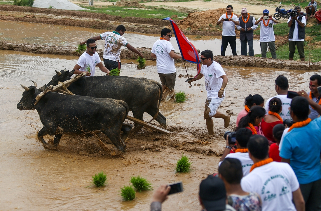 Nepalese farmers celebrate the National Paddy Day to mark the beginning of annual rice planting season