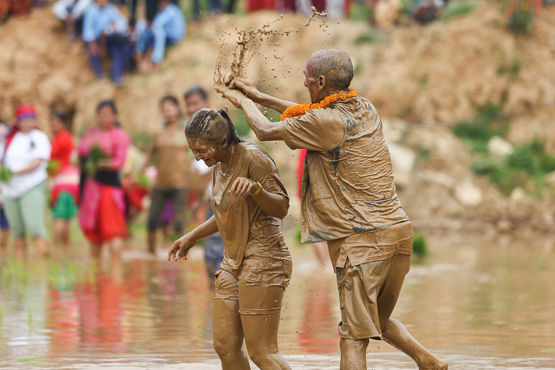 A man splashes muddy water onto a lady during the celebration of the National Paddy Day at the Dhunibesi Muncipality, in Dhading, Nepal on June 30, 2019. Photo: Sunil Pradhan/SOPA Images/LightRocket via Getty Images/VCG figcaption >