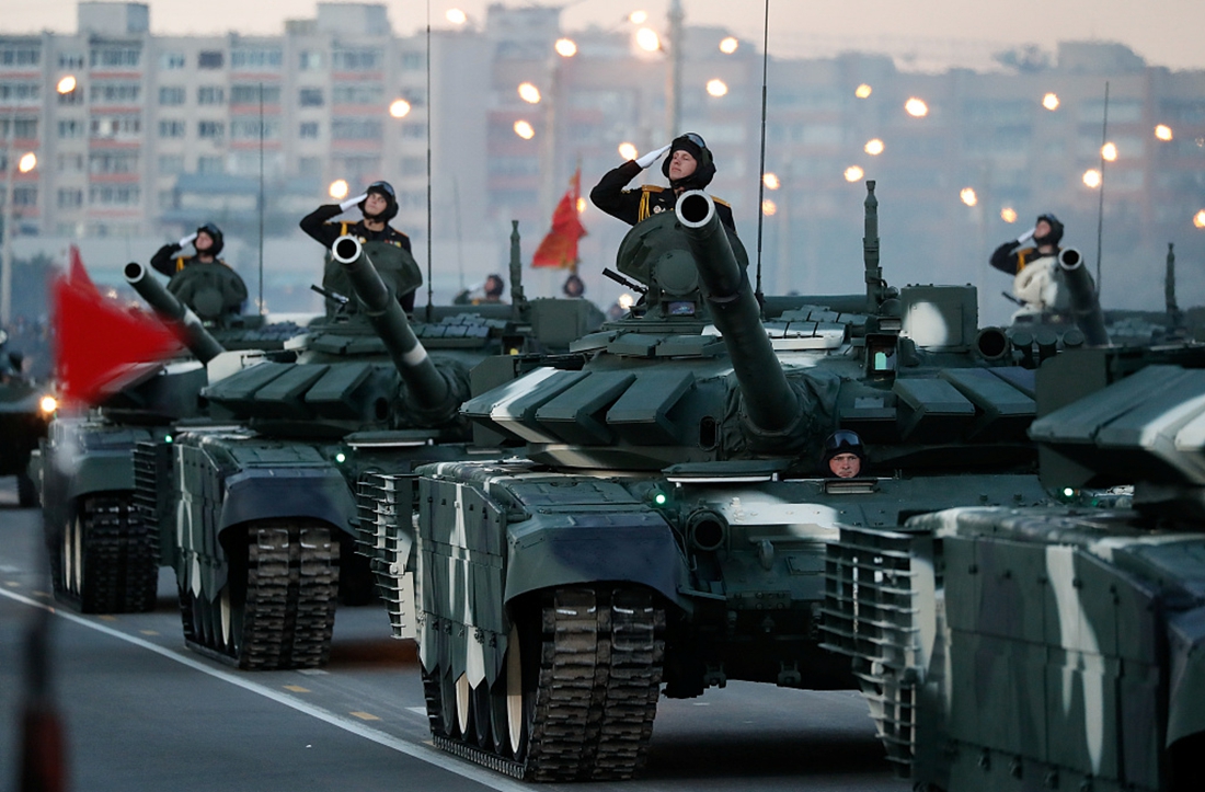 Troops from the Belarusian army drive tanks during a military parade marking the Belarus Independence Day in Minsk, Belarus on July 3, 2019. Photo: Vasily Fedosenko/VCG figcaption >