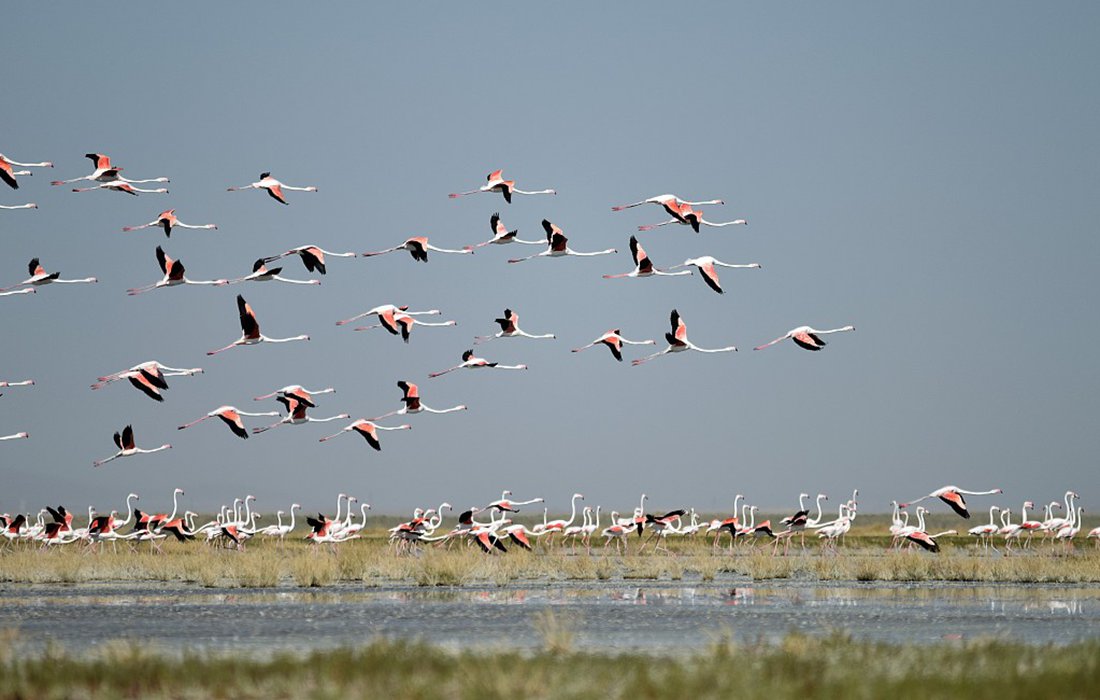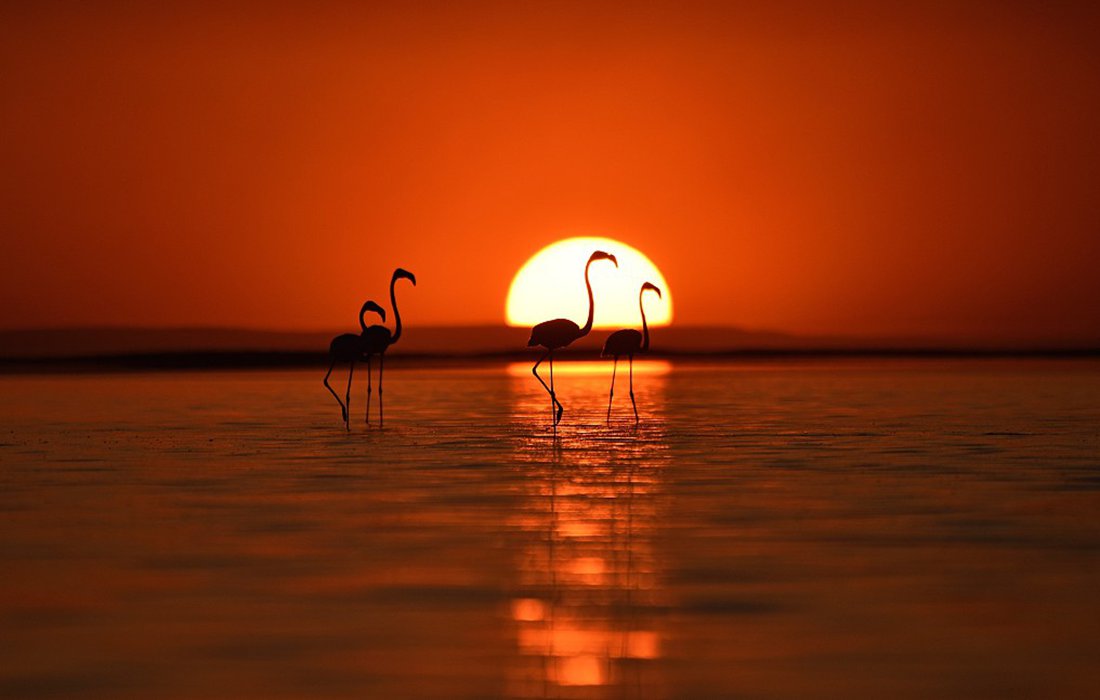 Flamingos are seen on Lake Tuz as the sun sets in the Konya province of Turkey on July 09, 2019. Lake Tuz is one of the most important areas where flamingos incubate in Turkey. Photo: VCG