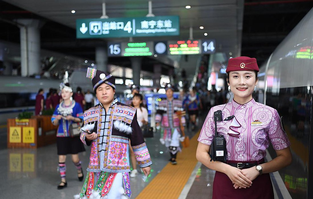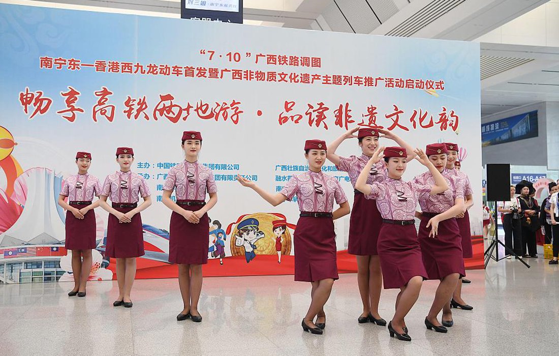 Stewardesses perform in their traditionally decorated uniforms at Nanning East Railway Station in South China's Guangxi Zhuang Autonomous Region on July 10, 2019. Photo: VCG figcaption >