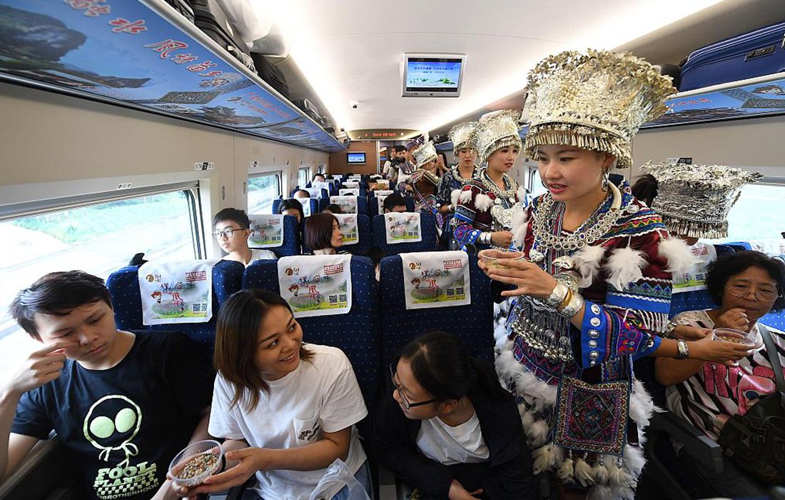 Performers from Rongshui Miao ethnic group invite the passengers to taste butter tea in the G417 bullet train on July 10, 2019. Photo: VCG figcaption >