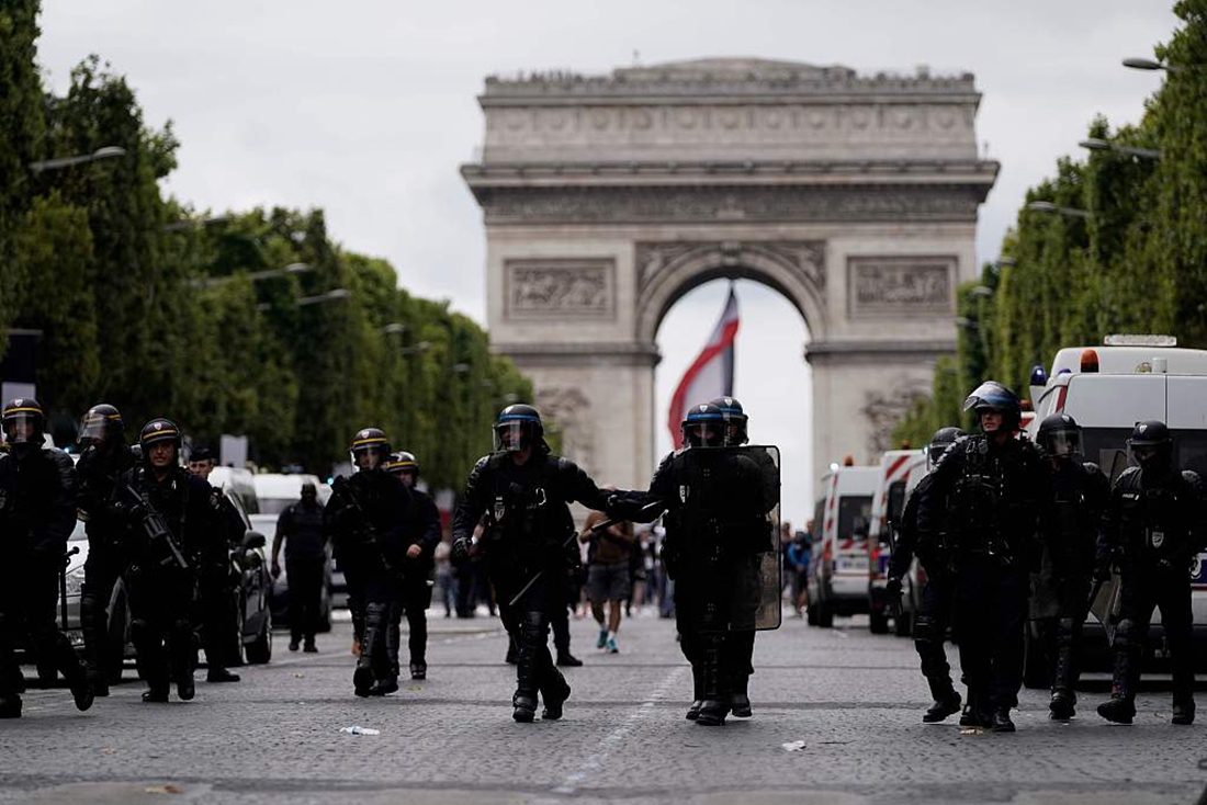 Members of the French Gendarmes stand in front of the Arc de Triomphe as protesters linked to the Yellow Vests movement take part in a demonstration on the side of the traditional Bastille Day ceremony, on July 14, 2019, on the Champs-Elysees in Paris. Photo: Kenzo TRIBOUILLARD/VCG figcaption >