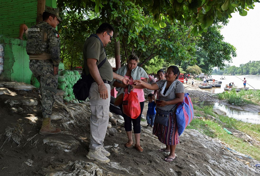 An agent of the National Migration Institute and a member of Mexico's National Guard check the IDs of people who have crossed the Suchiate River on a raft from Tecun Uman, Guatemala, to Ciudad Hidalgo, Mexico on July 15, 2019. Photo: Jose Torres/VCG figcaption >