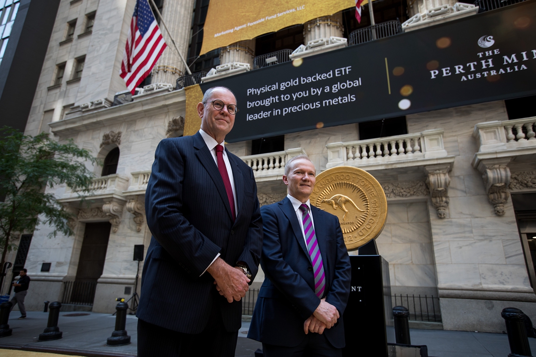 Richard Hayes (left), chief executive officer of the Perth Mint, and Joe Metcalfe, deputy chief executive officer of the Perth Mint, stand in front of the world's largest gold bullion coin, Australian Kangaroo One Tonne Gold Coin, during the launch of the Perth Mint Physical Gold ETF outside the New York Stock Exchange in New York, US, on July 16, 2019. Photo: VCG figcaption >