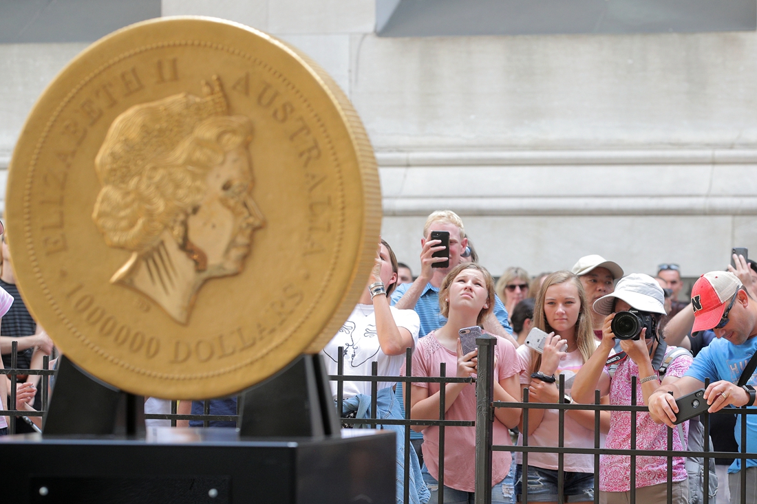 People take photographs of the world's largest gold bullion coin, the Australian Kangaroo One Tonne Gold Coin, which is displayed to mark the official launch of the Perth Mint Physical Gold ETF, outside the New York Stock Exchange in New York, US, on July 16, 2019. Photo: Brendan McDermid/VCG figcaption >